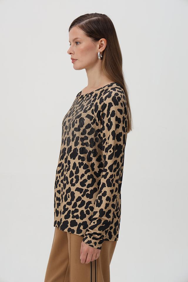 Эта стильная футболка от Monari станет ярким акцентом в вашем образе. Модель выполнена в бежевом цвете с эффектным леопардовым принтом, который придаёт ей современный и трендовый вид.