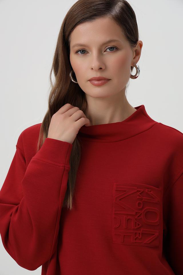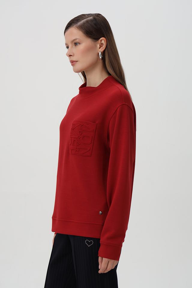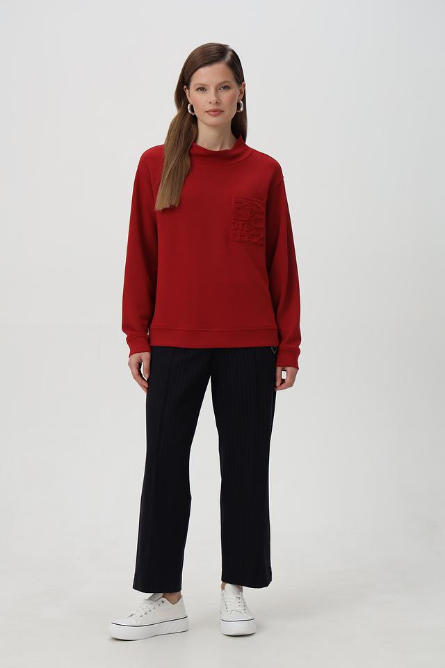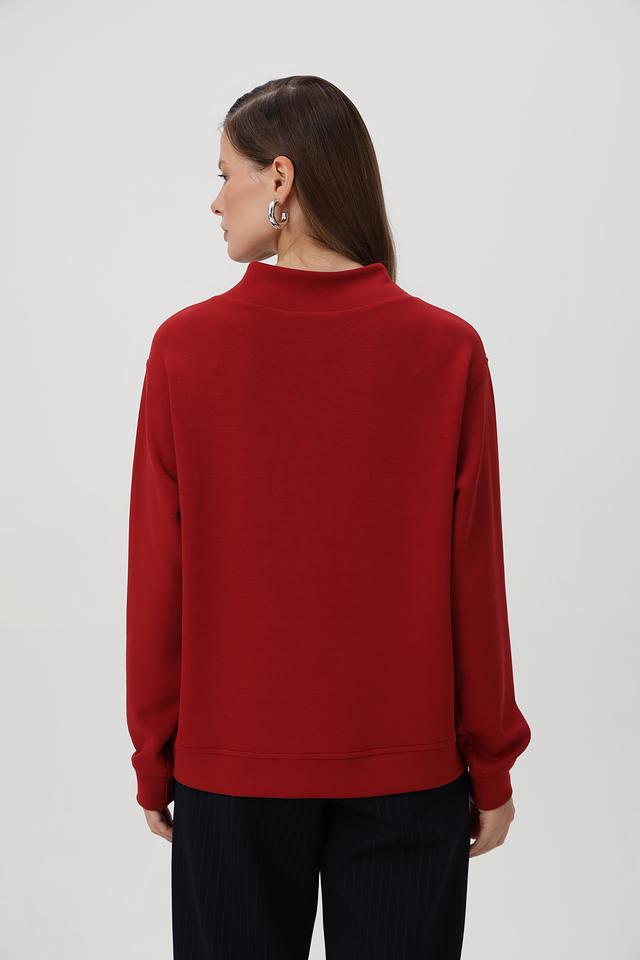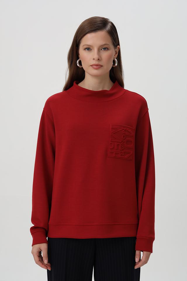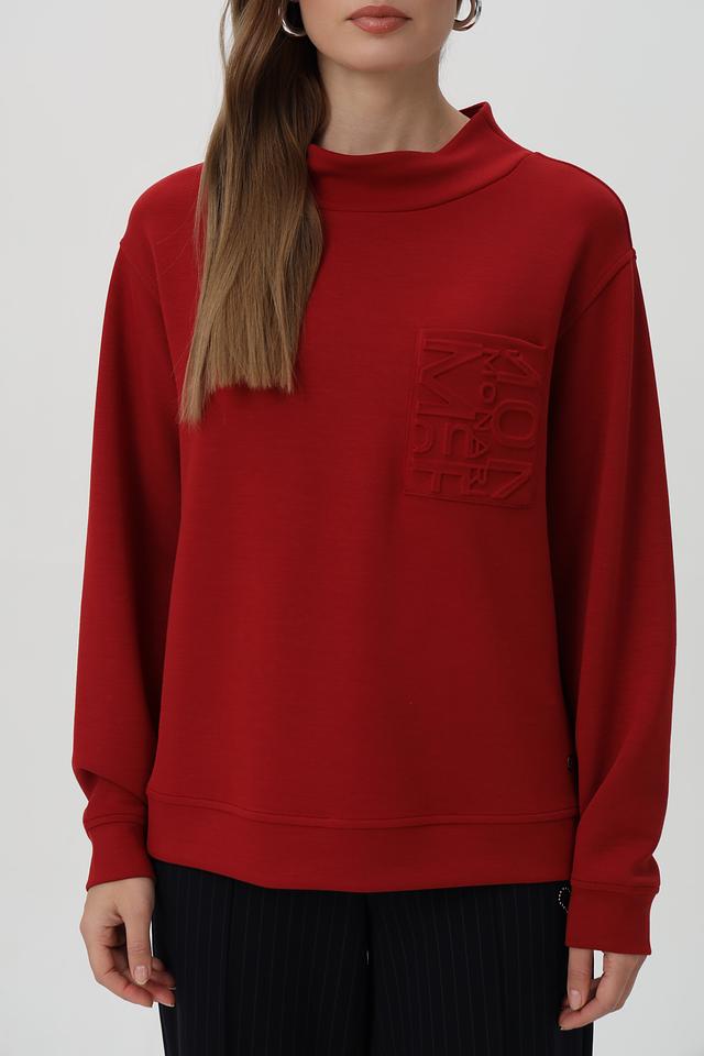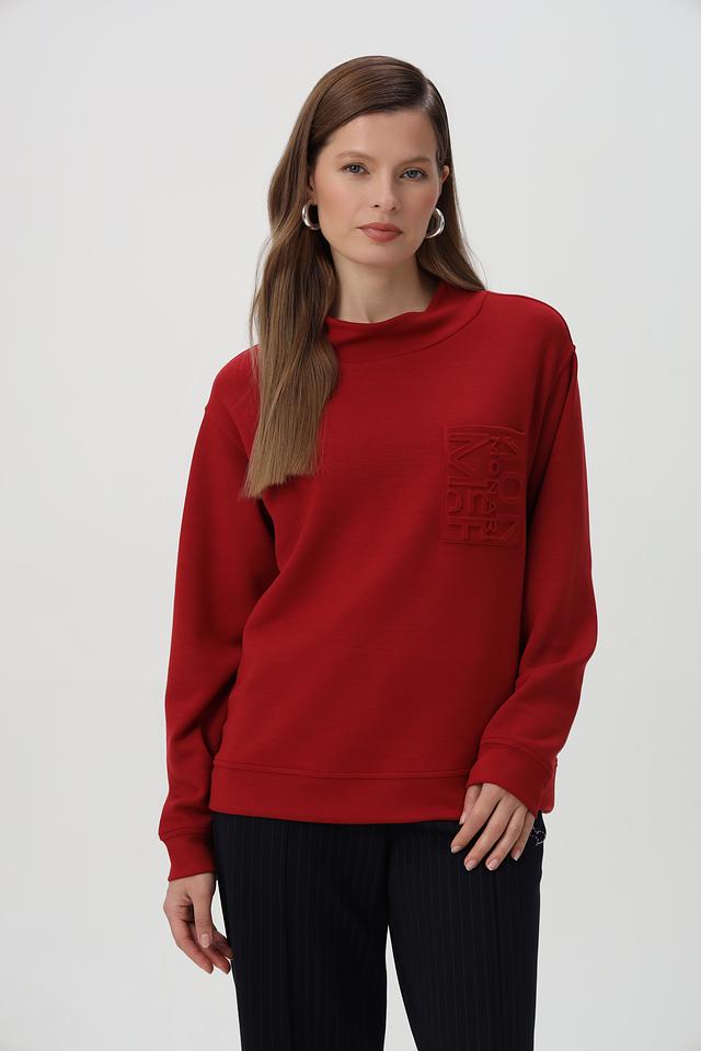 Женский пуловер от бренда Monari выполнен в насыщенном красном цвете. Модель имеет свободный крой и удобный воротник-стойку, который придает образу элегантность.
