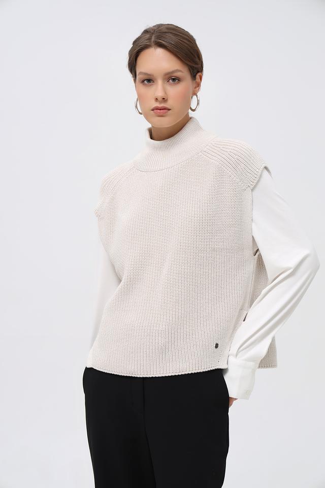 Этот бежевый вязаный жилет от Monari станет отличным выбором для создания многослойных образов. Он имеет удобный высокий воротник и свободный крой, который не сковывает движения.