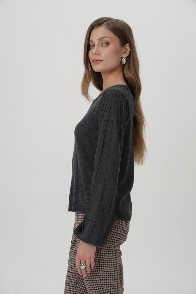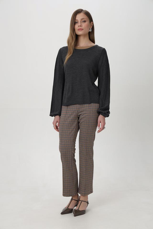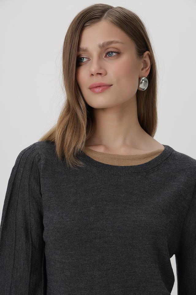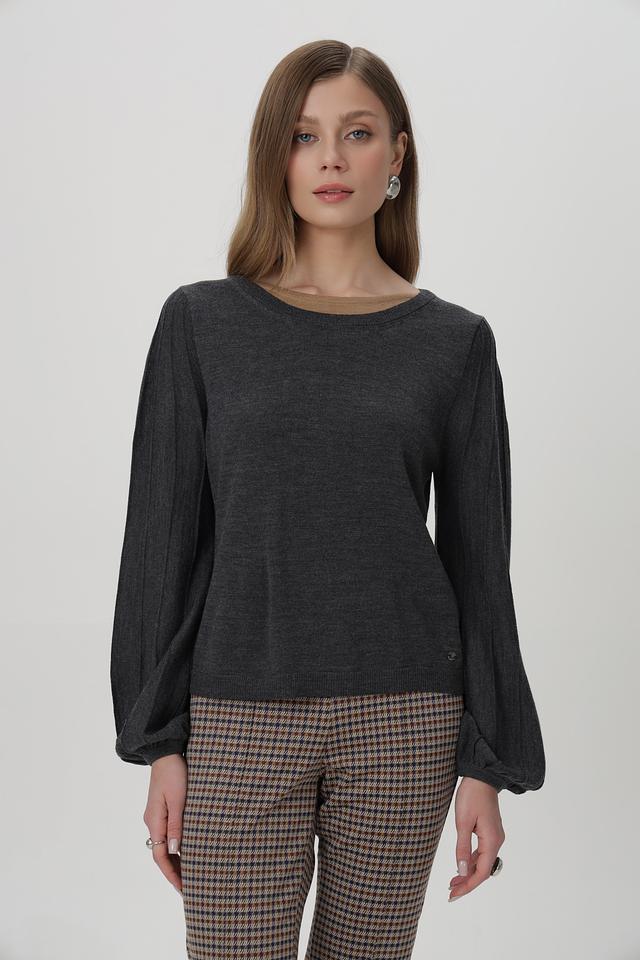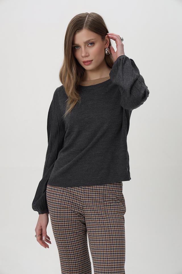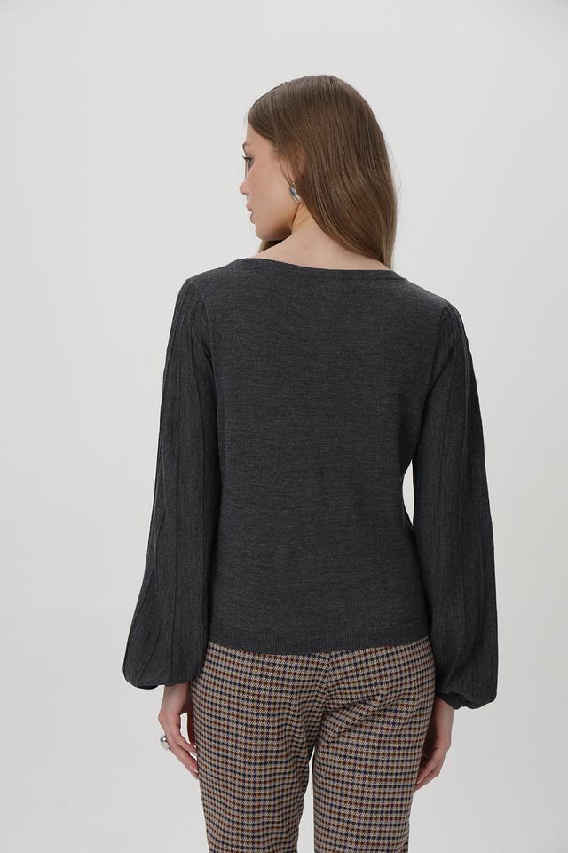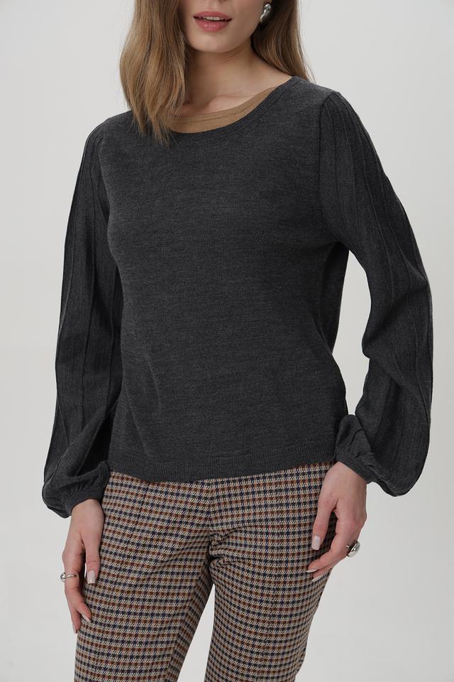 Пуловер имеет классический круглый вырез и длинные рукава с манжетами, собранными в объёмные фонарики, что придает образу изящество. Приталенный силуэт подчеркивает фигуру, а текстурный трикотаж добавляет интереса.