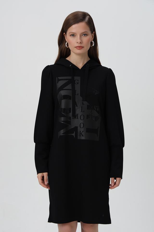 Особенностью модели является оригинальный декор в виде надписи и страз, которые добавляют образу изысканности и привлекательности. Платье имеет удобный капюшон и длинные рукава, обеспечивающие комфорт в прохладную погоду.
