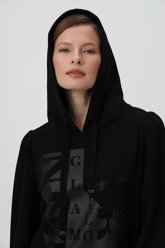 Это стильное платье-худи от Monari станет отличным дополнением к вашему гардеробу. Выполнено в классическом чёрном цвете, оно легко сочетается с различными аксессуарами и обувью.