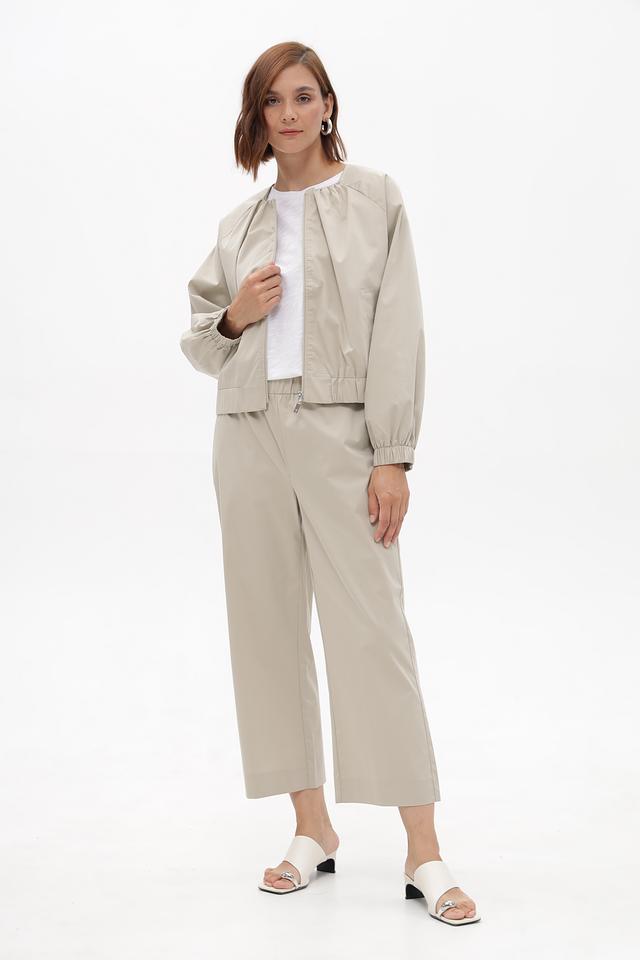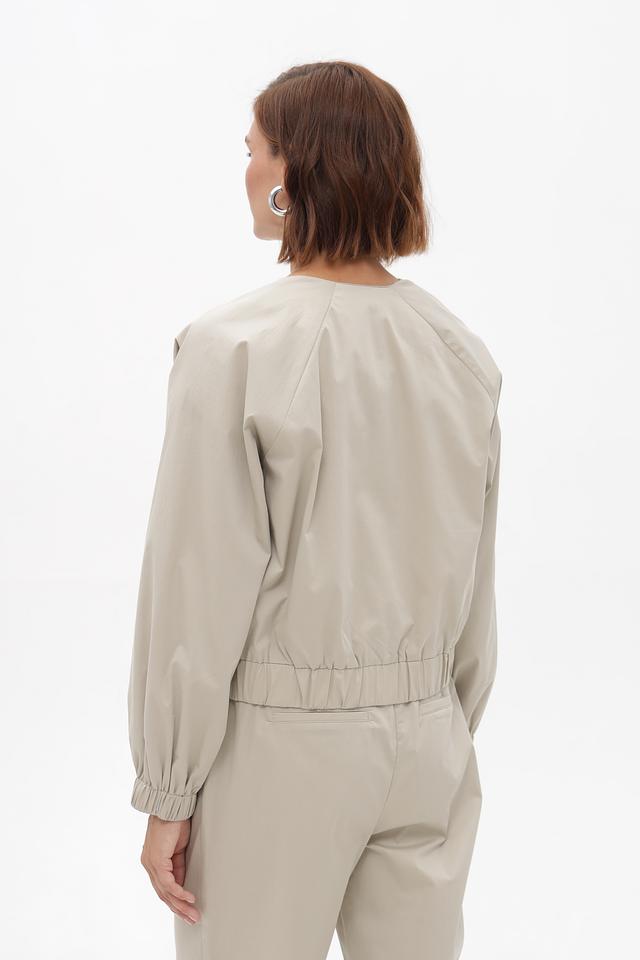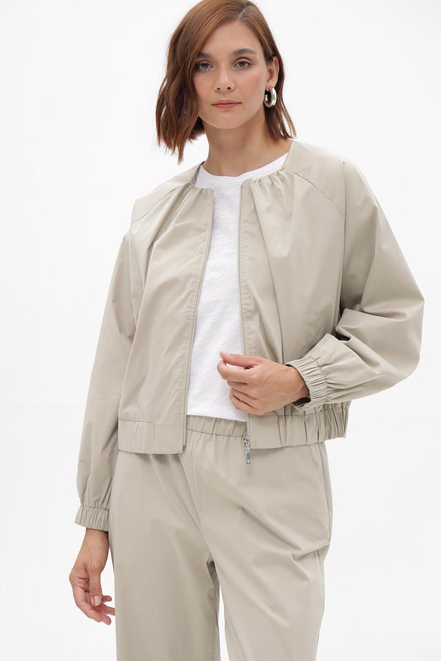 Женский жакет от бренда Monari выполнен в бежевом цвете. Модель имеет свободный крой и длину до талии. Застежка — молния по центру. Воротник — стойка.