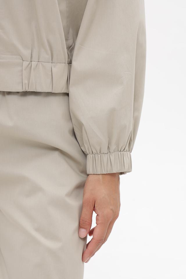 Рукава жакета — фонарики, с манжетами по низу. По горловине выполнена сборка, при которой создается легкая драпировка. Жакет изготовлен из смесового материала, в состав которого входит хлопок, полиамид и эластан. Такая комбинация обеспечивает комфорт в носке, устойчивость к сминанию и легкий уход.