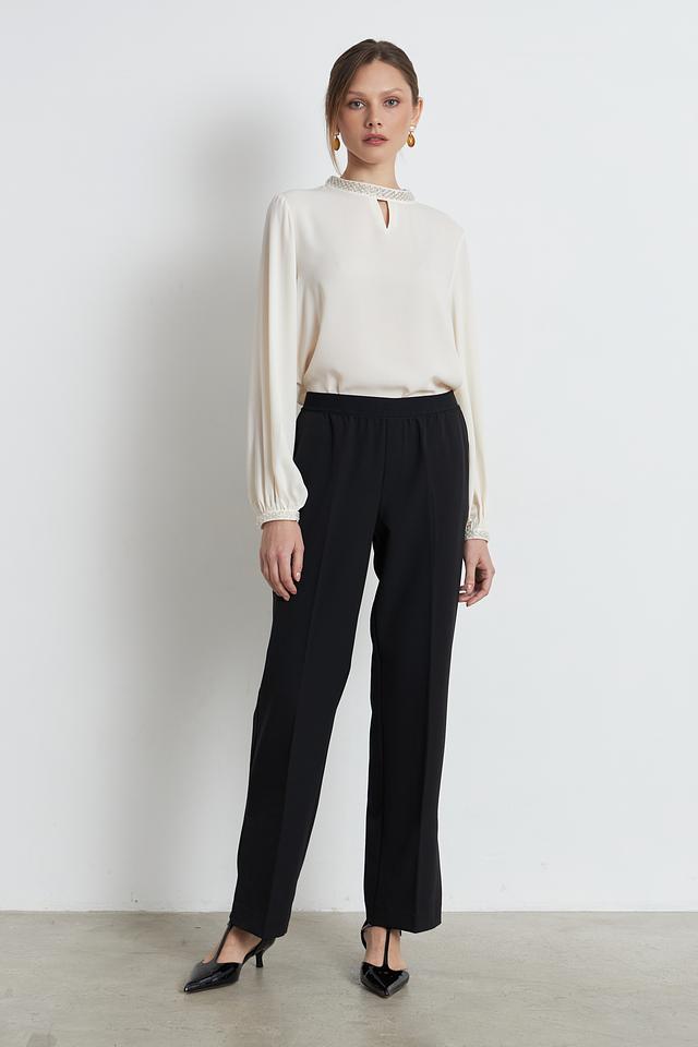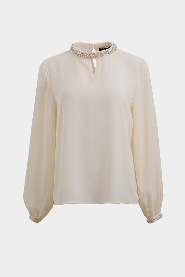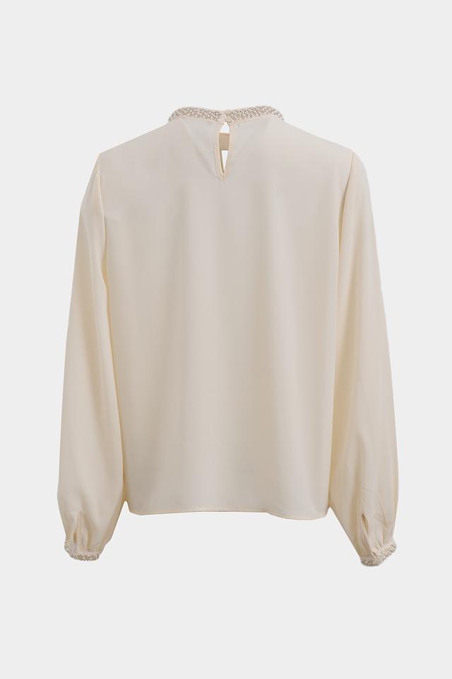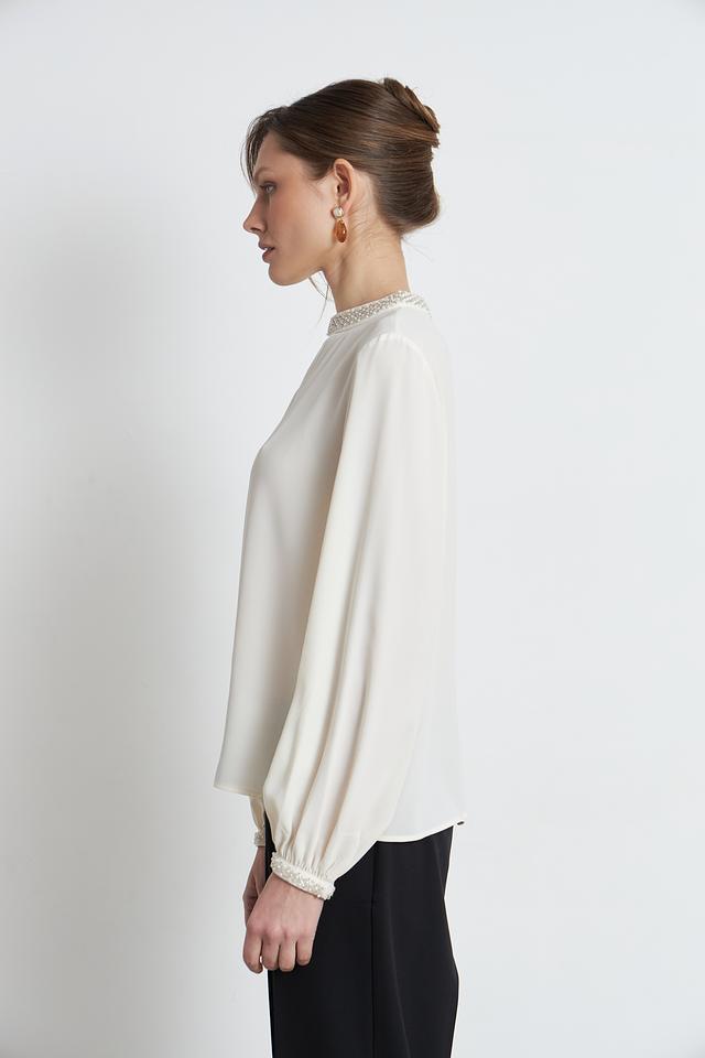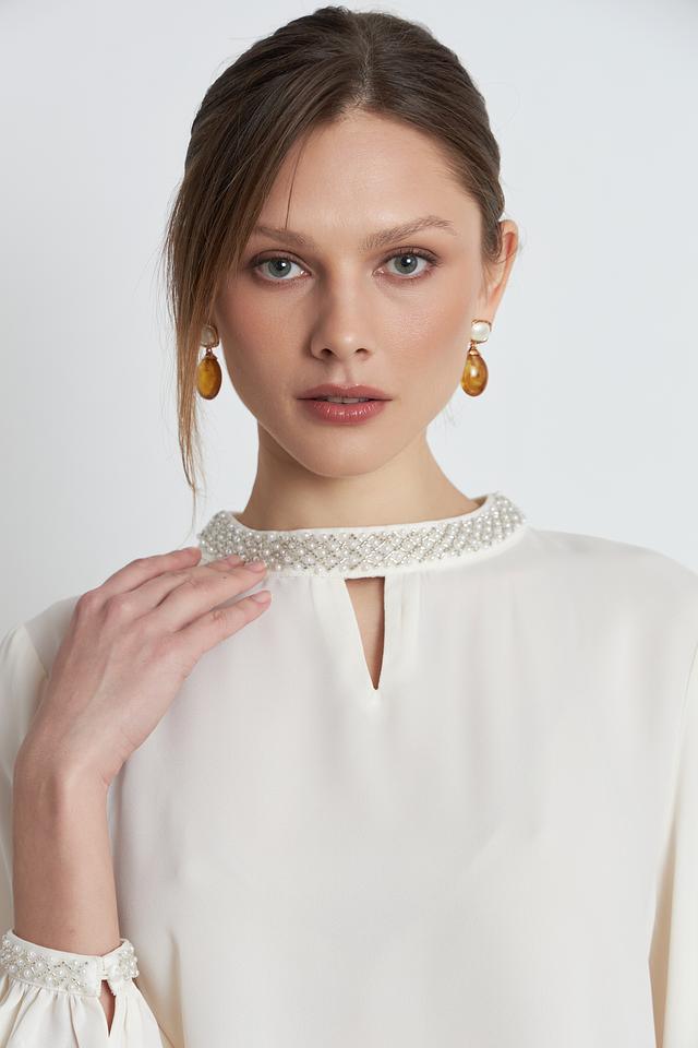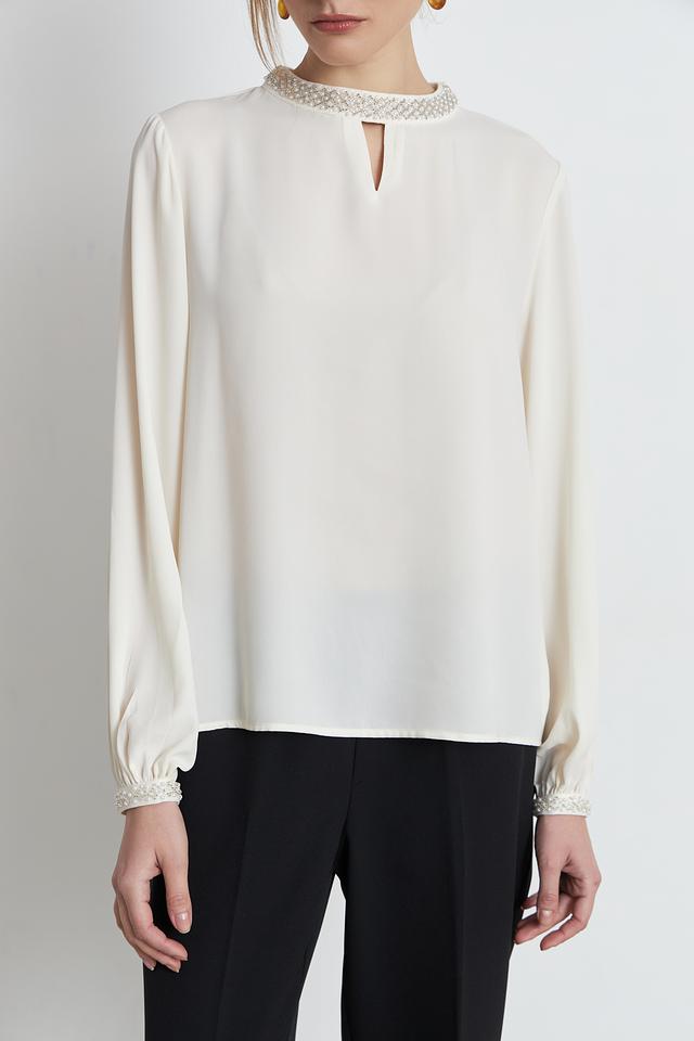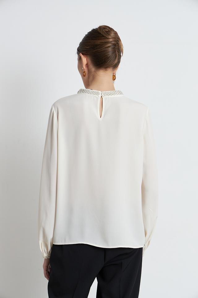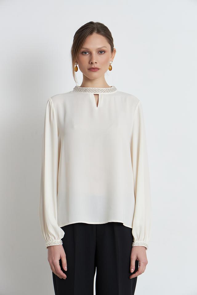 Особый шарм изделию придаёт деликатная отделка жемчугом по горловине и на манжетах рукавов. Рукава-фонарики добавляют блузке романтичности и лёгкости. V-образный вырез горловины подчеркивает женственность силуэта.