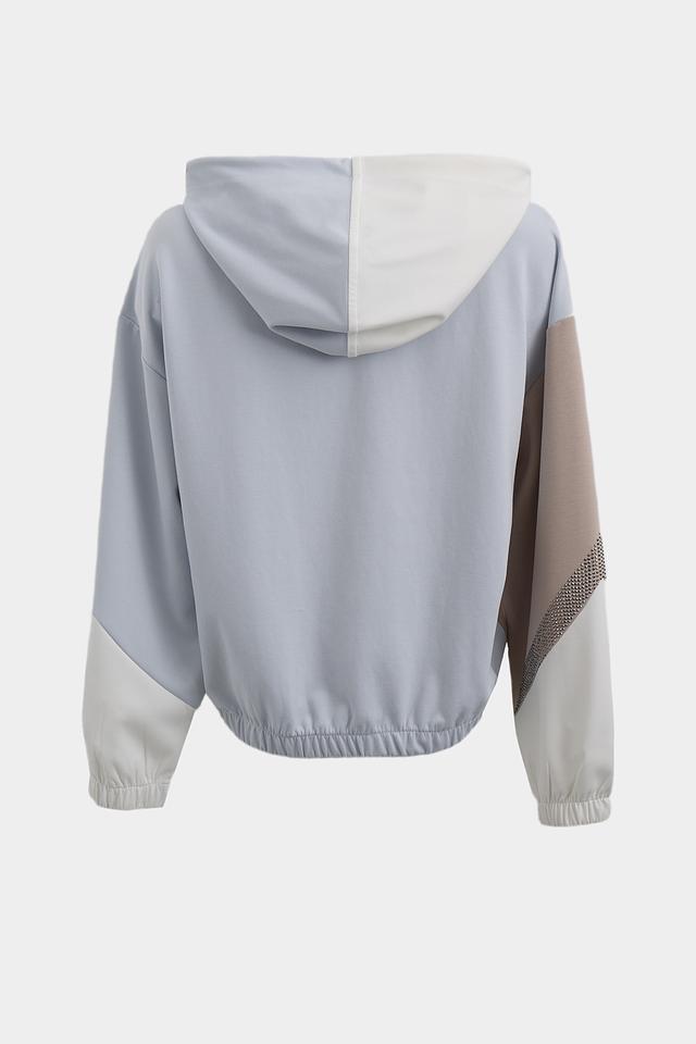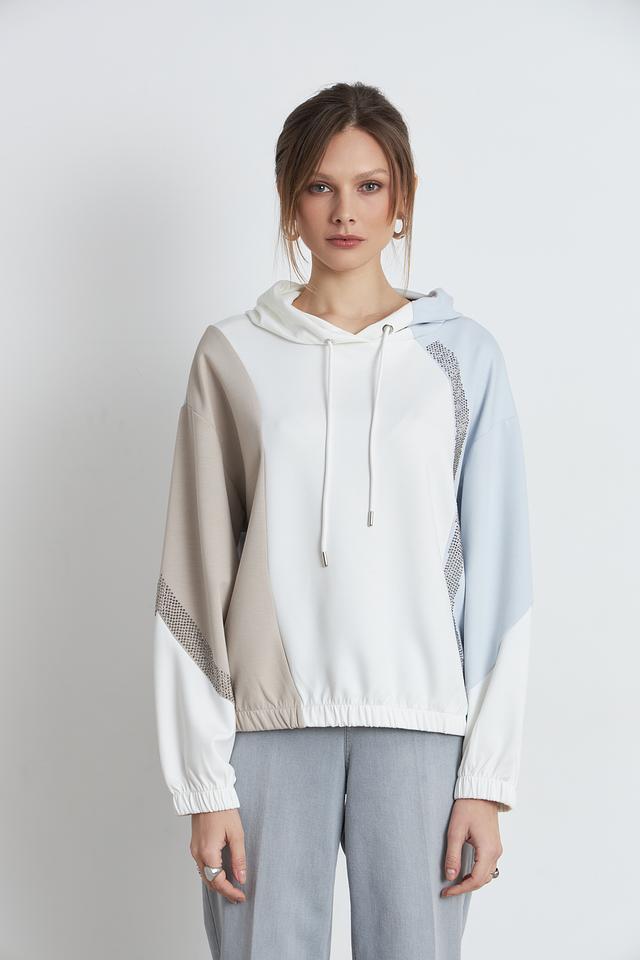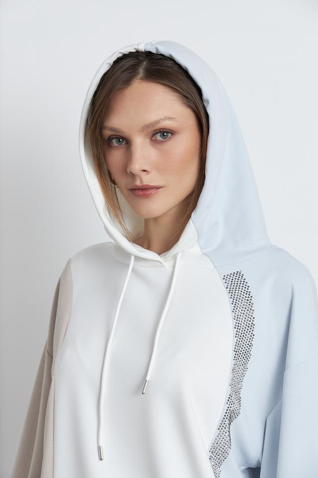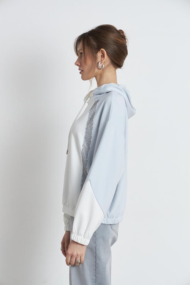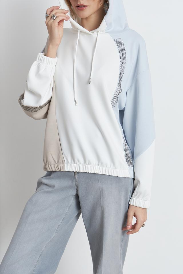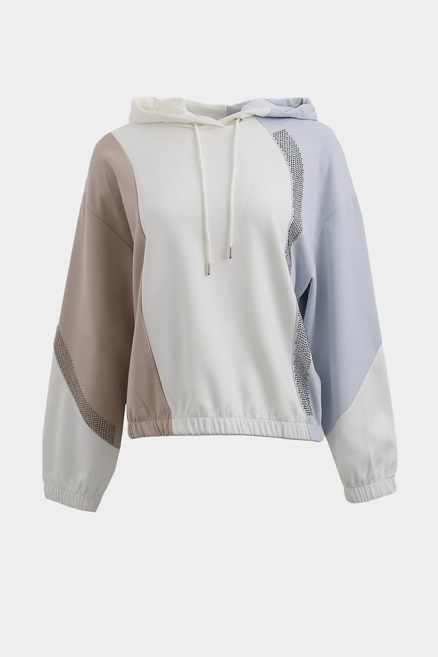 Пуловер имеет свободный крой, капюшон со шнурками и манжеты на рукавах, обеспечивающие удобную посадку. Оригинальный акцент – декоративные вставки из сетки, украшенные стразами, которые придают изделию изысканность.