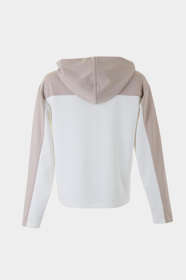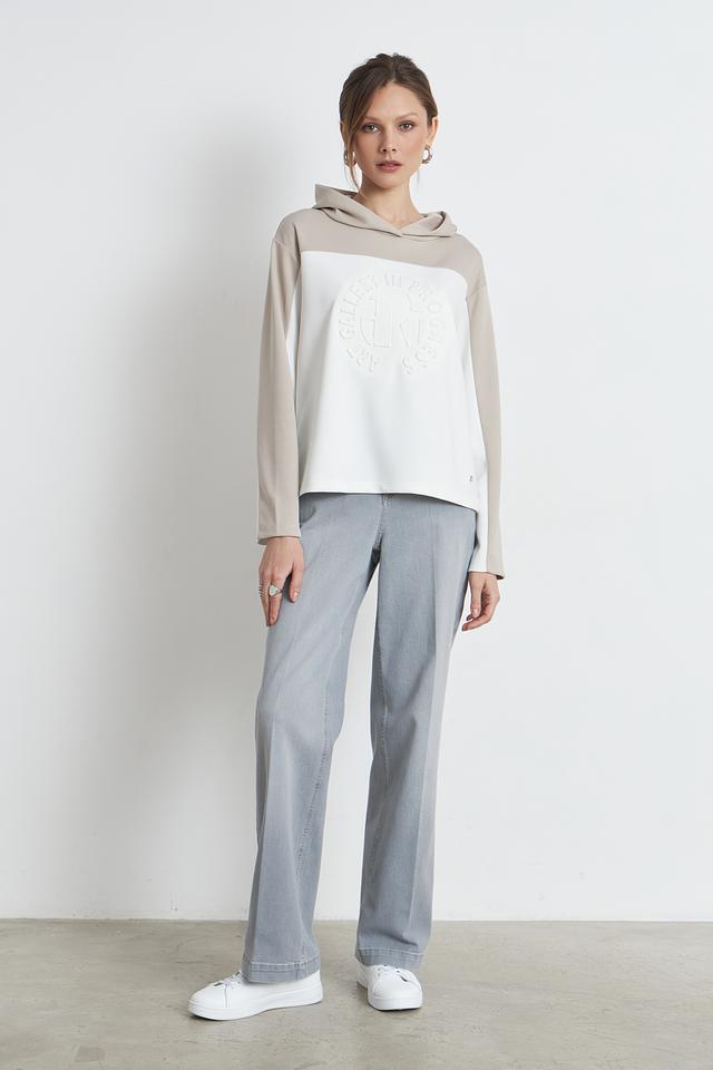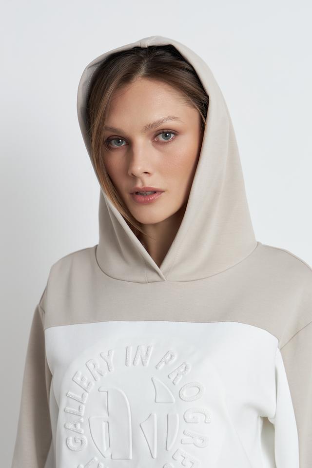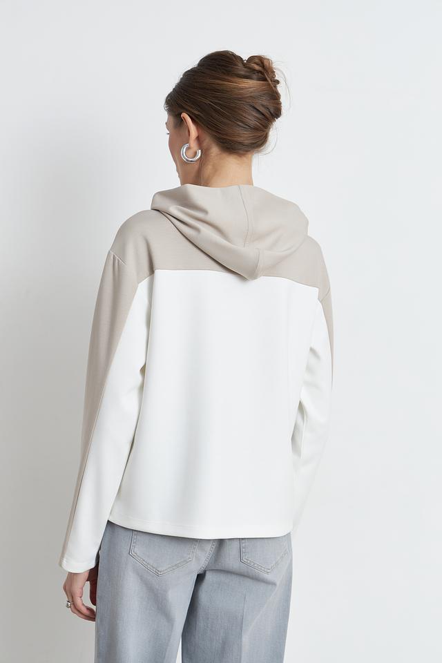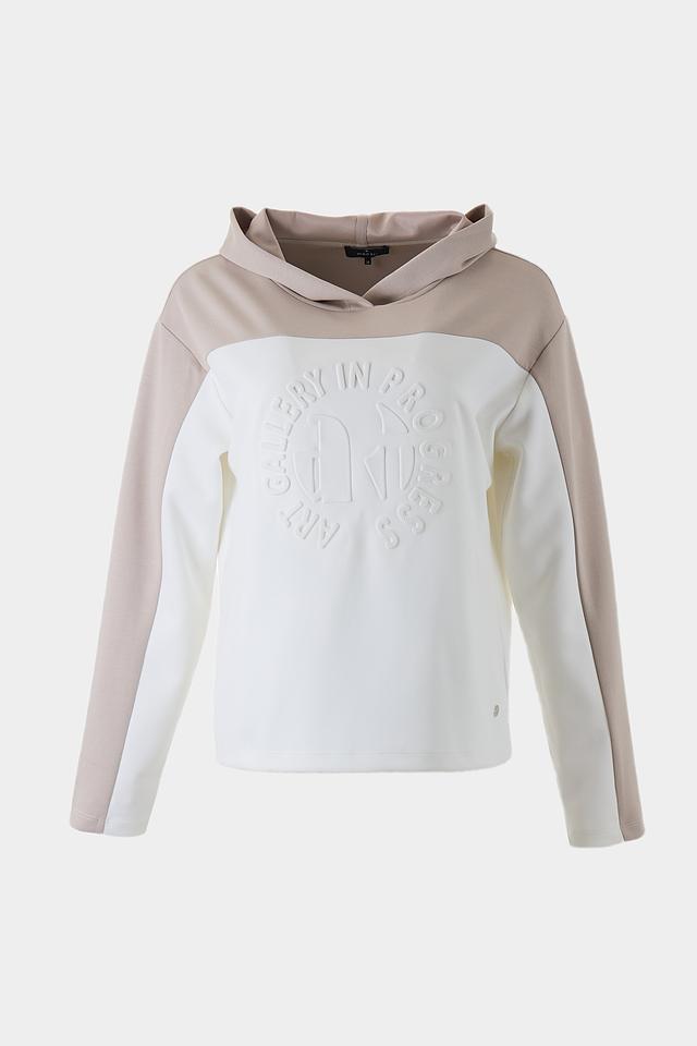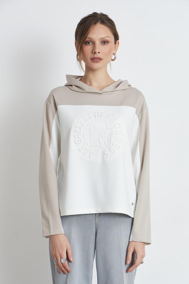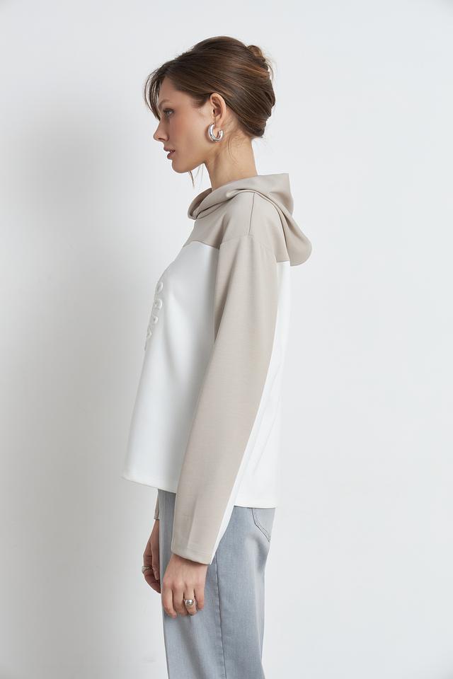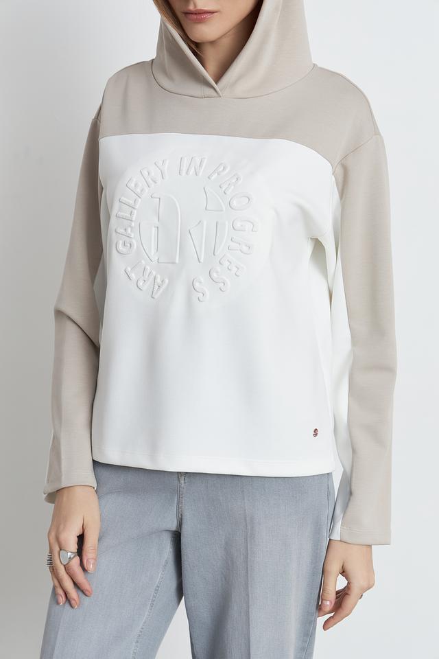 Женский пуловер Monari бежевого и белого цвета с оригинальной вышивкой на груди. Модель с капюшоном и свободным кроем станет отличным дополнением к вашему гардеробу. Состав: полиэстер 55%, вискоза 38%, эластан 7%