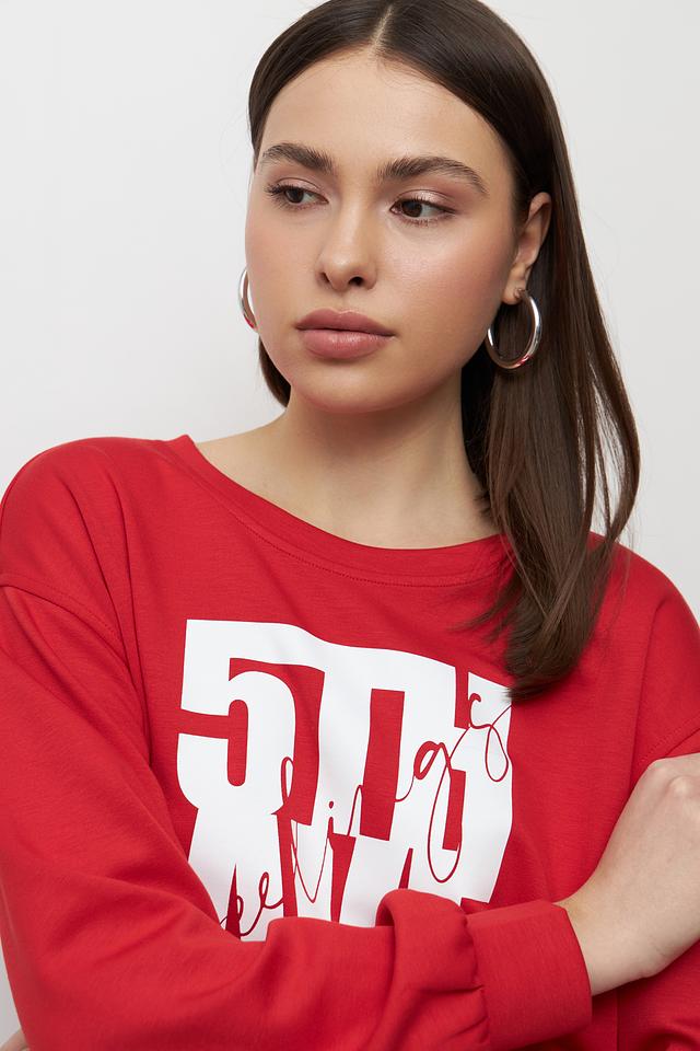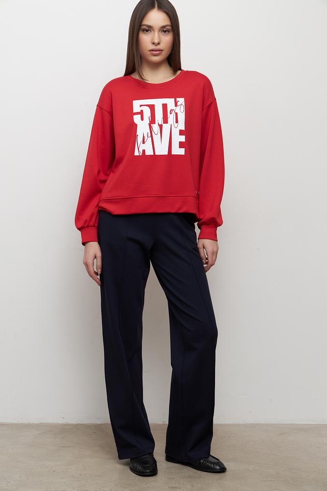 Этот стильный пуловер от Monari выполнен в насыщенном красном цвете и украшен крупным белым принтом с надписью "Feel the wave". Модель имеет свободный крой, который обеспечивает комфорт и свободу движений.