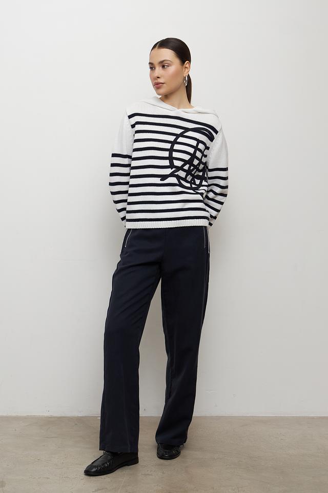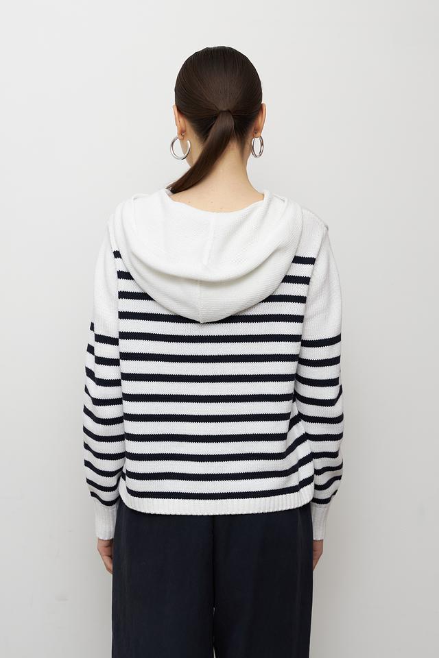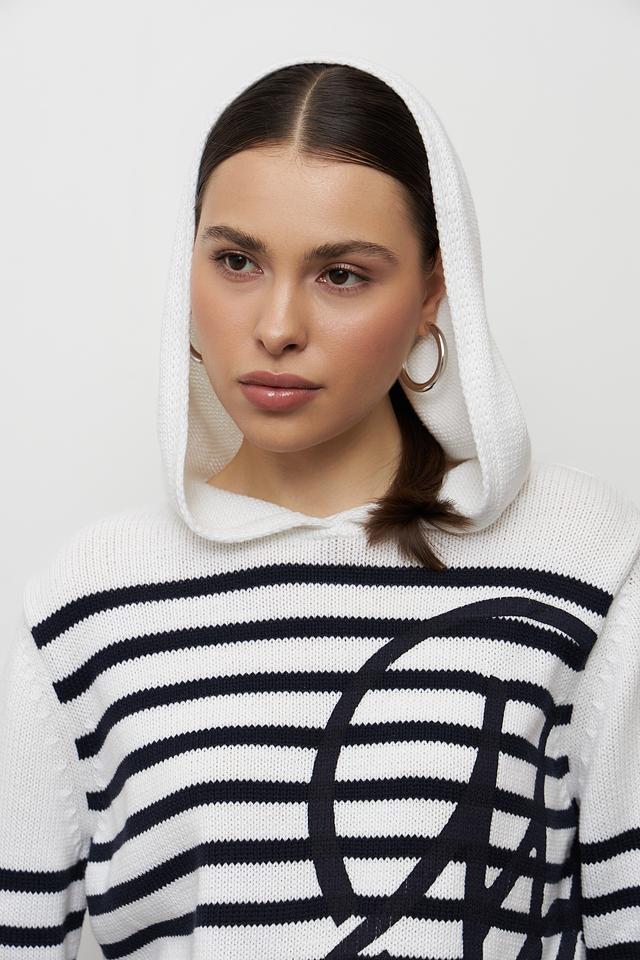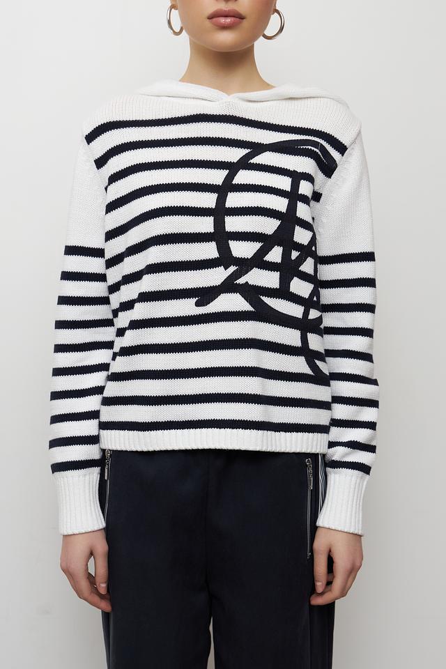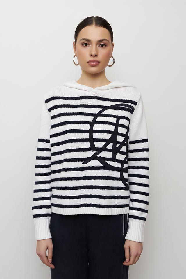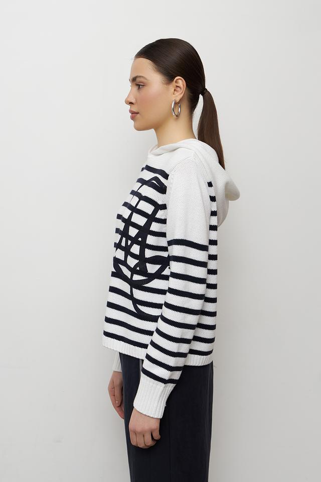 Женский пуловер Monari белого и тёмно-синего цвета, выполненный в полоску с оригинальным графическим принтом и капюшоном. Модель имеет удобный крой и выполнена из мягкого хлопкового трикотажа. Состав: хлопок 60%, полиакрил 40%