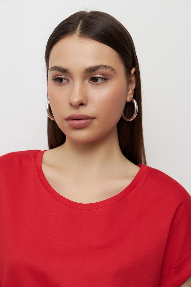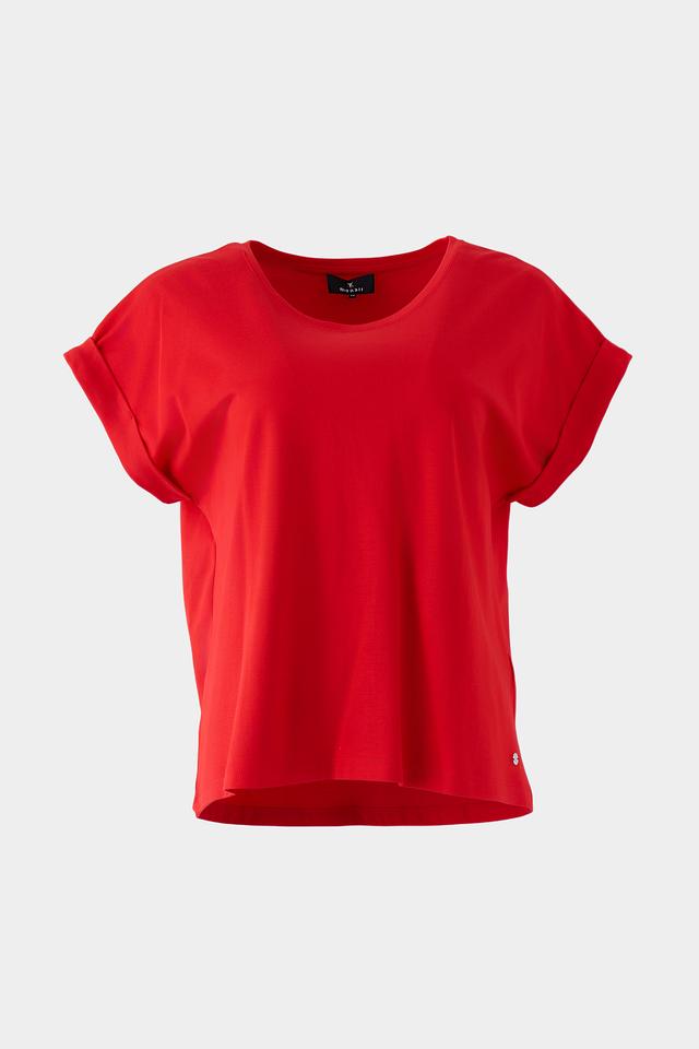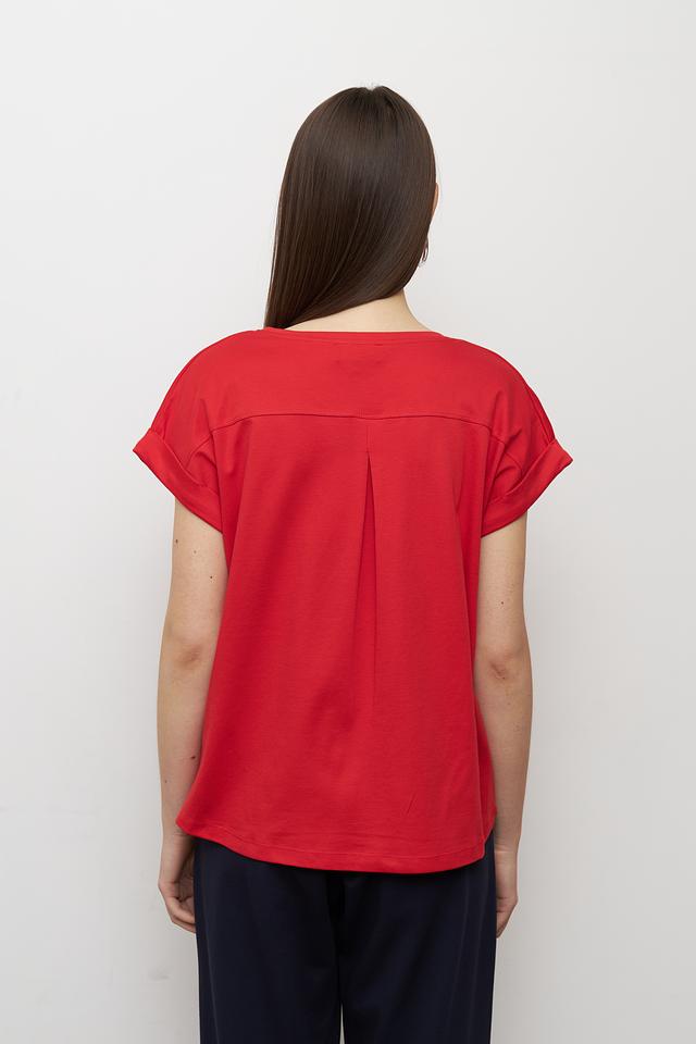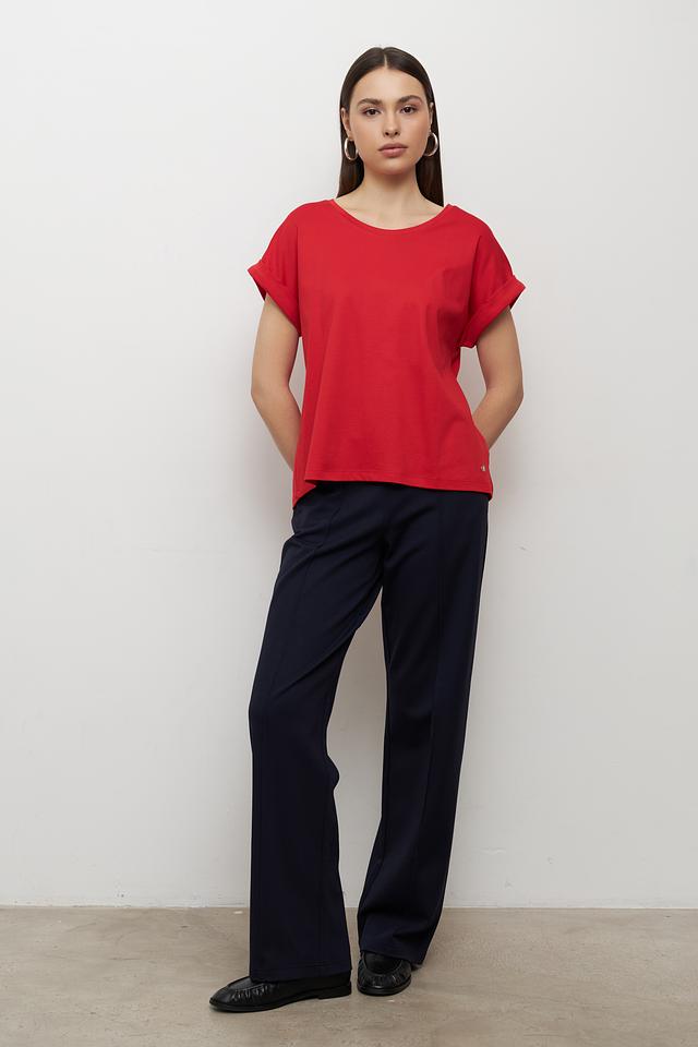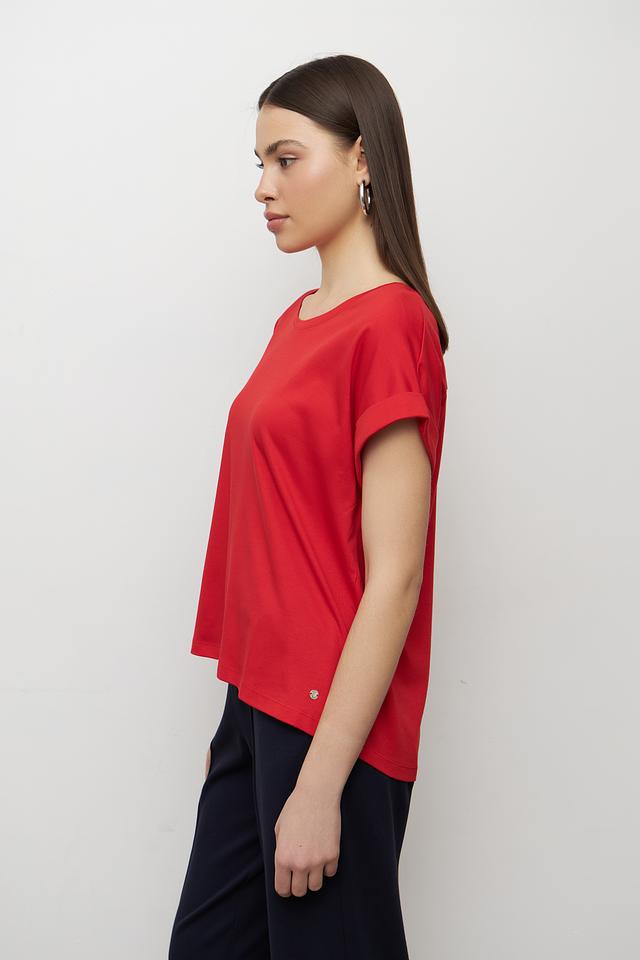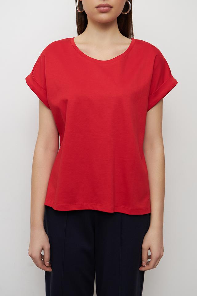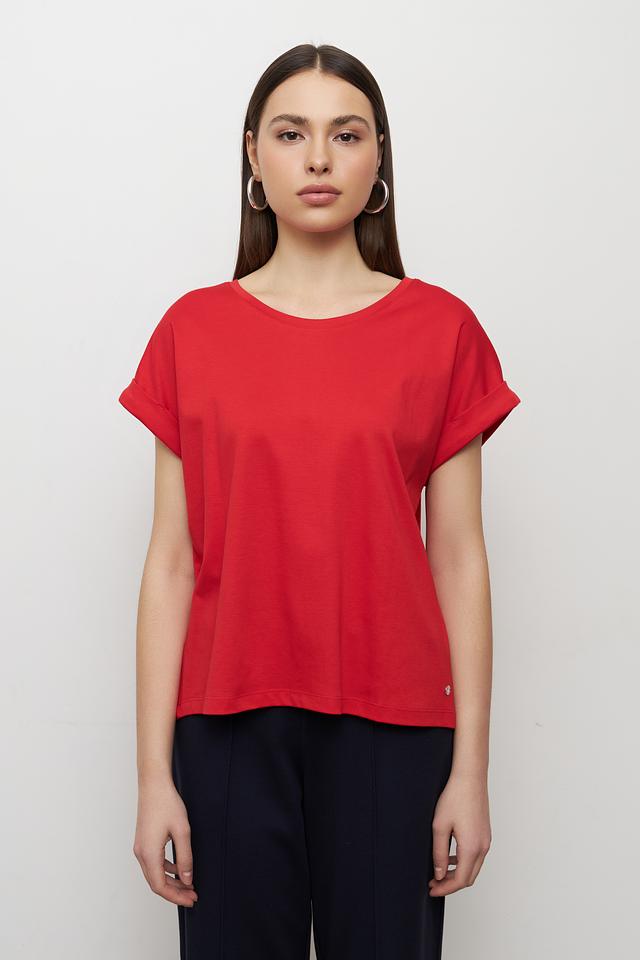 Красная футболка Monari из 100% хлопка — это стильное и комфортное решение для повседневного гардероба. Свободный крой и короткие рукава с подворотами придают модели непринужденный вид. Состав: хлопок 100%