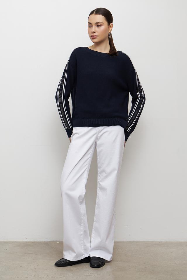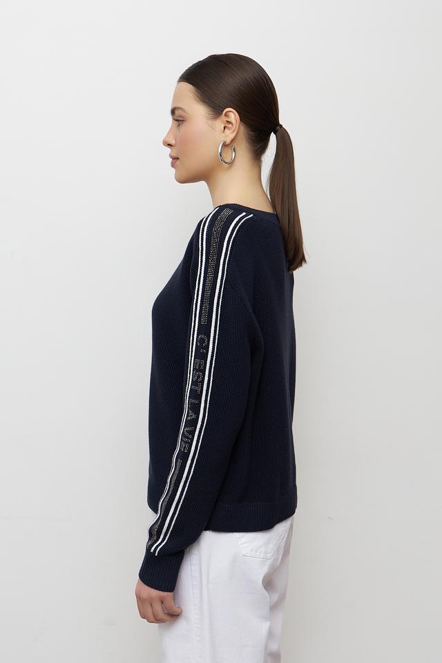 Пуловер имеет прямой крой и круглый вырез горловины. Белые полоски на рукавах придают модели динамичный и современный вид. Изготовлен из 100% хлопка, что обеспечивает мягкость, приятные тактильные ощущения и комфорт при носке.