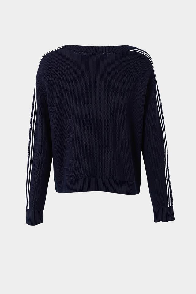 Стильный пуловер Monari темно-синего цвета с контрастными белыми полосками на рукавах. Изготовлен из мягкого хлопка, обеспечивающего комфорт в носке. Идеально дополнит повседневный гардероб. Состав: хлопок 100%