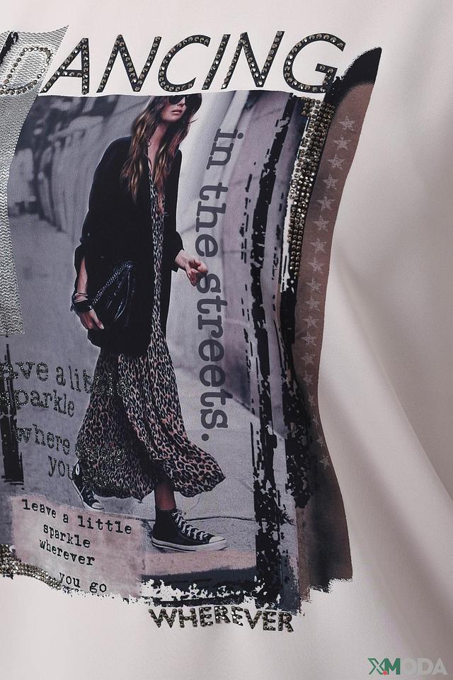 Эта блуза от Monari – отличный выбор для создания повседневного и непринужденного образа. Блуза выполнена в нежном бежевом цвете и украшена эффектным принтом с надписью "Dancing in the streets" и изображением девушки.