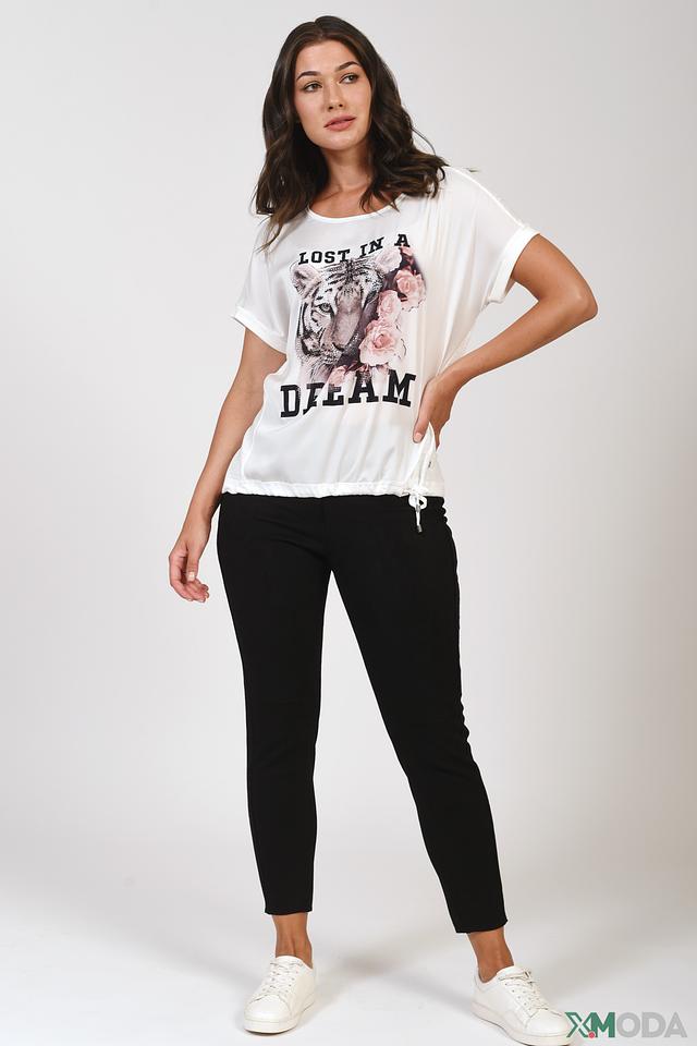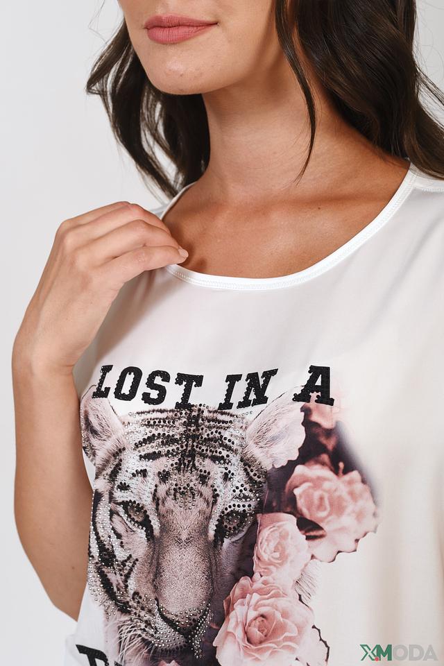 Белая футболка Monari с ярким принтом тигра и надписью "LOST IN A DREAM". Модель свободного кроя с короткими рукавами и декоративной отделкой по низу изделия. Состав: Состав_2 полиэстер 100%, хлопок 50%, модал 50%