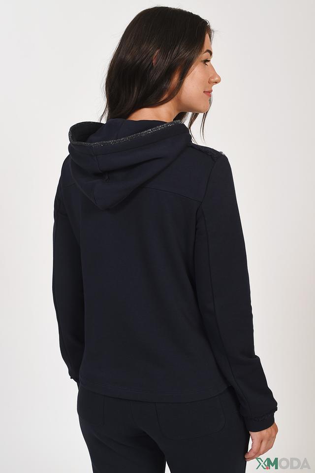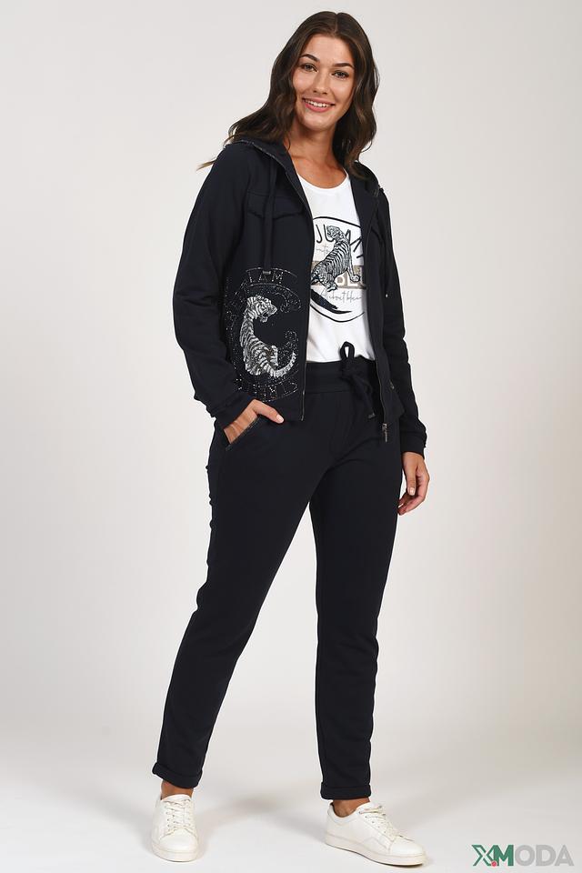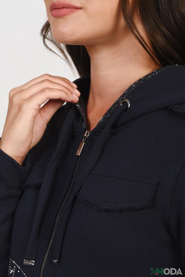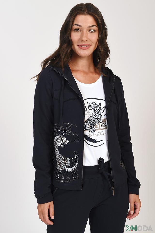 Чёрный жакет Monari с капюшоном, украшенным стразами, и эффектным принтом тигра. Модель на молнии с боковыми карманами и декоративной обработкой краев. Состав: хлопок 80%, полиэстер 20%