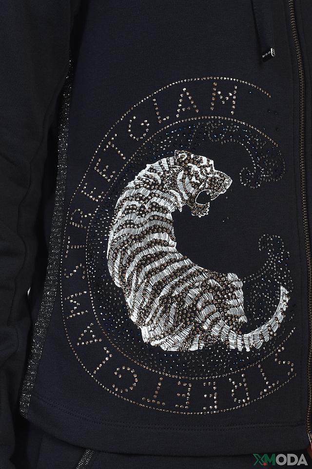Жакет имеет удобный капюшон, отделанный сверкающими стразами, и застёгивается на молнию. Передняя часть украшена крупным принтом тигра, выполненным в технике аппликации со стразами, что придает изделию роскошный вид.