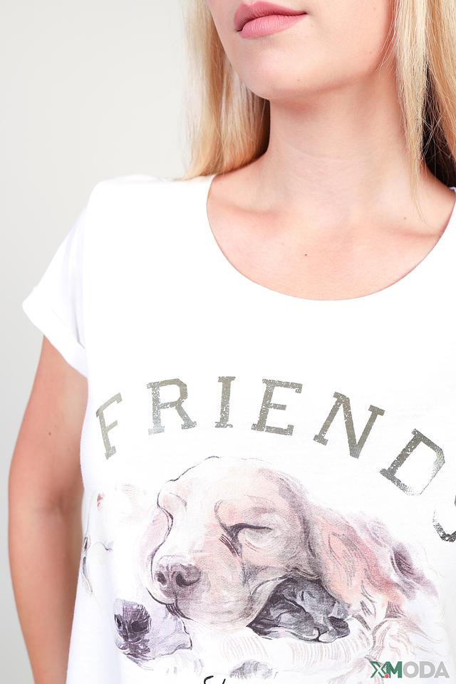 Особенностью данной модели является яркий принт "Friends" с изображением милых щенков и вдохновляющей надписью. Футболка имеет классический крой с короткими рукавами и круглым вырезом горловины.