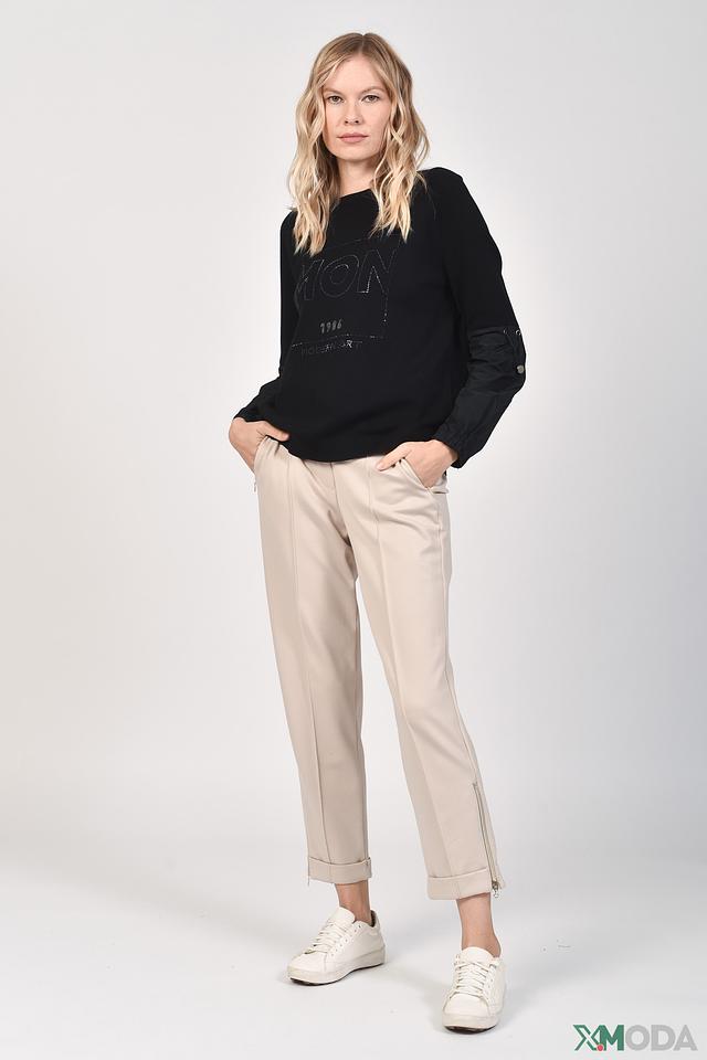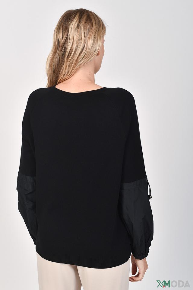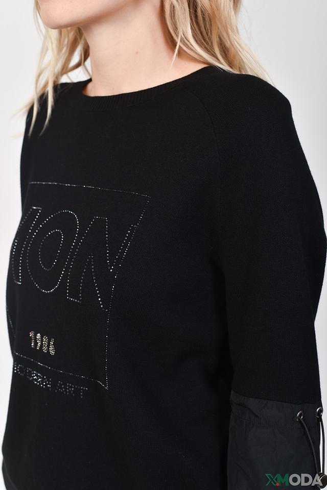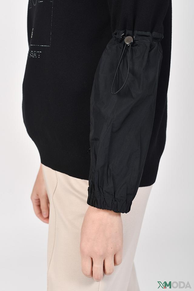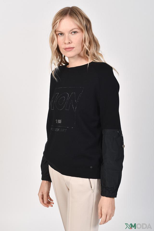 Чёрный пуловер Monari с оригинальным декором из страз и вставками из плащевой ткани. Модель выполнена из мягкого хлопка и отличается комфортным кроем и стильным дизайном. Состав: хлопок 100%