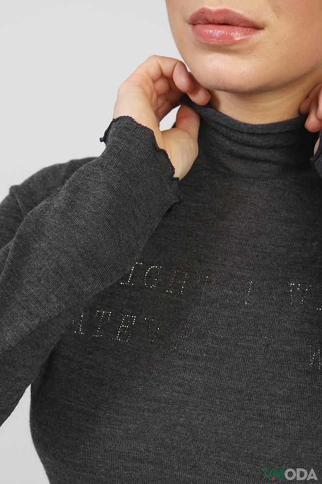 Модель имеет классический крой с высоким воротом и длинными рукавами. Передняя часть водолазки украшена стильной надписью, выполненной в тон изделия. Ткань приятна на ощупь и хорошо держит форму.