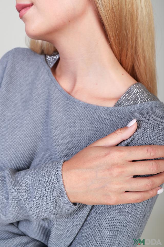 Пуловер имеет серый цвет и текстурированную вязку, которая придает ему объем и оригинальность. Особый акцент сделан на горловине, украшенной изящной вышивкой, добавляющей изделию женственности и элегантности.
