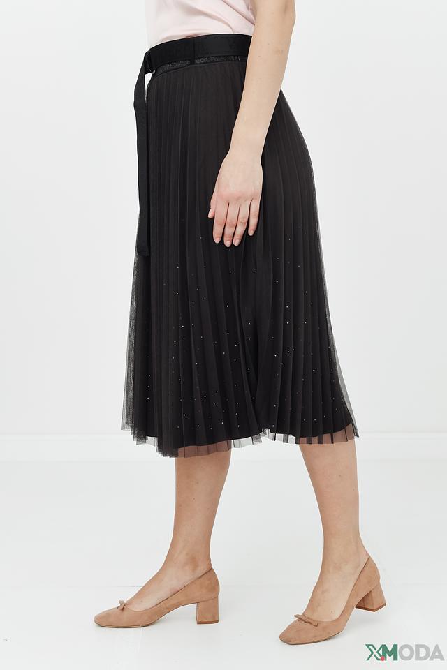 Юбка имеет плиссированную фактуру, которая придает ей лёгкость и воздушность. Подкладка из вискозы с добавлением эластана обеспечивает комфорт при носке. Модель украшена деликатной вышивкой из мелких страз, которые придают ей праздничный вид.