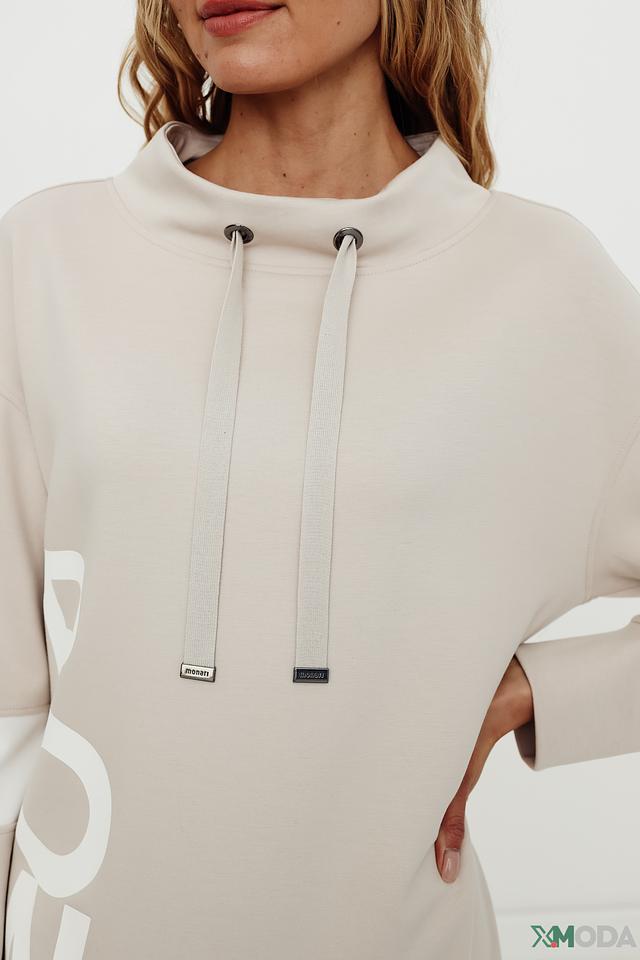 Бежевое платье от Monari – это стильное и комфортное решение для повседневного образа. Модель выполнена из мягкого трикотажа с актуальной надписью и удобным капюшоном. Состав: полиэстер 78%, вискоза 18%, эластан 4%