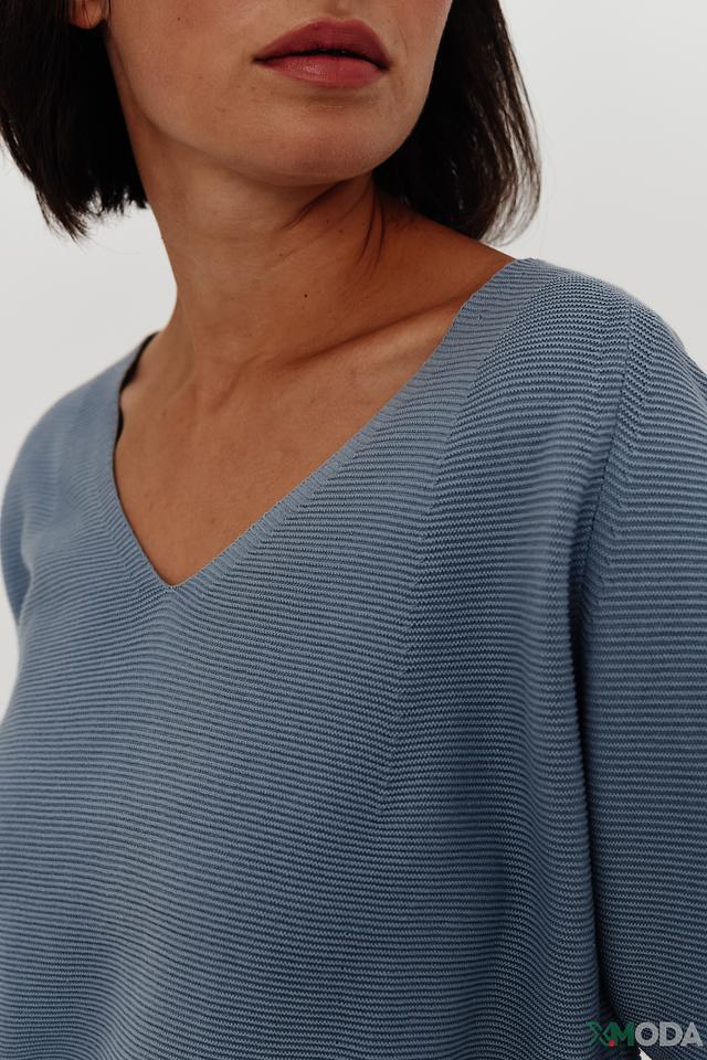 Дизайн пуловера отличается V-образным вырезом, который визуально удлиняет шею и делает образ более женственным. Рукав 3/4 добавляет элегантности и позволяет сочетать пуловер с различными аксессуарами.