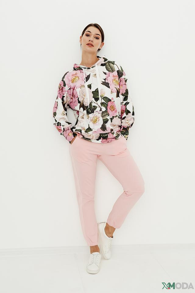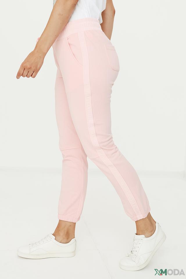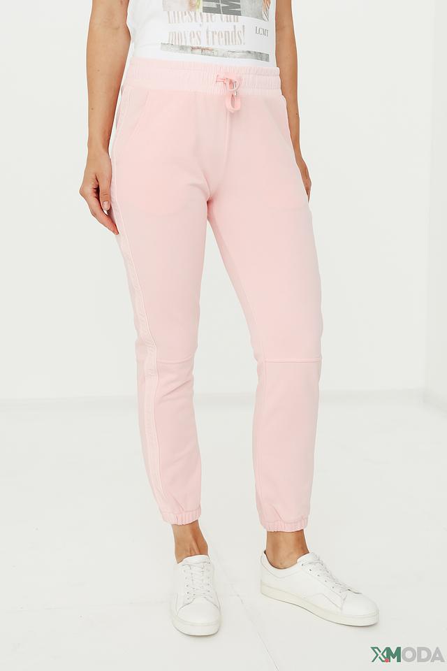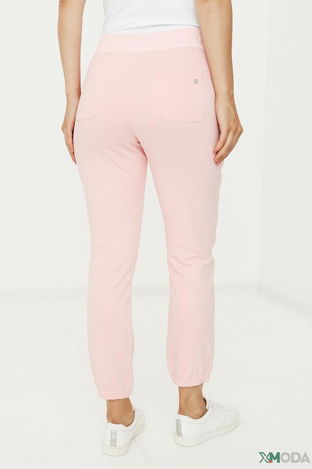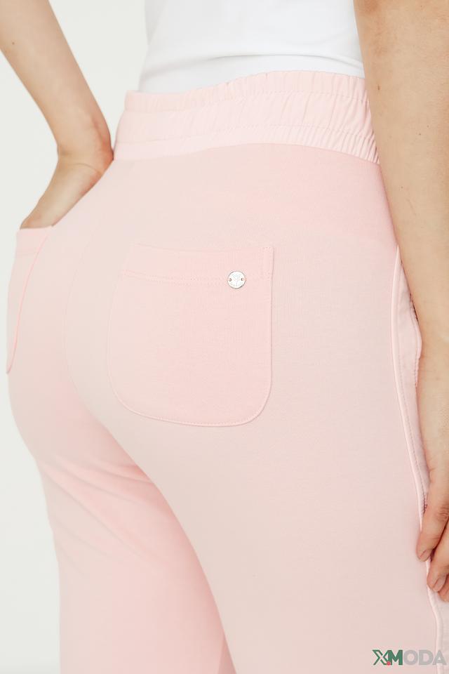 Модель имеет прямой крой, эластичный пояс на шнуровке и боковые карманы. Низ брюк собран на манжет, что придает им более современный и расслабленный вид. Нежный пудрово-розовый цвет легко сочетается с различными элементами одежды, позволяя создавать разнообразные стильные образы.