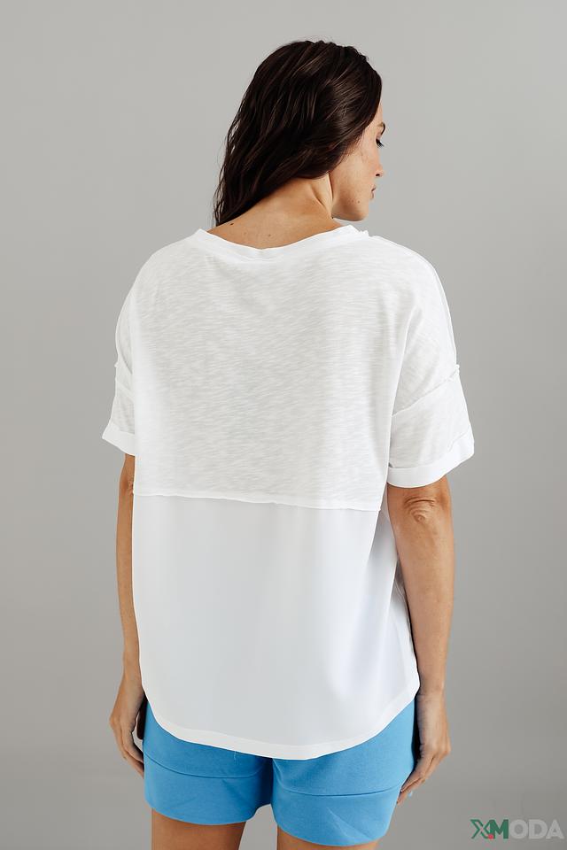 Белая футболка Monari с оригинальным принтом "TAKE TIME". Модель свободного кроя из мягкого хлопка с модалом обеспечит комфорт в течение дня. Идеальный выбор для создания повседневных образов. Состав: хлопок 50%, модал 50%