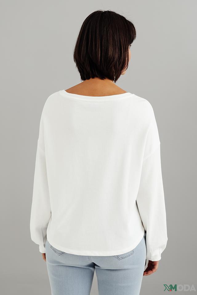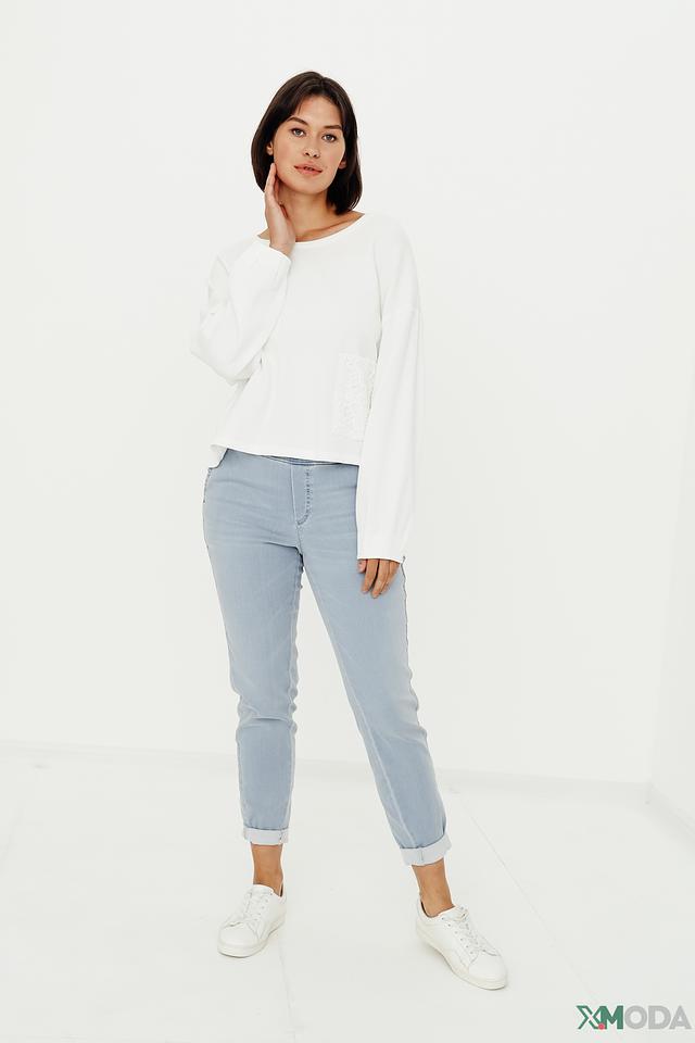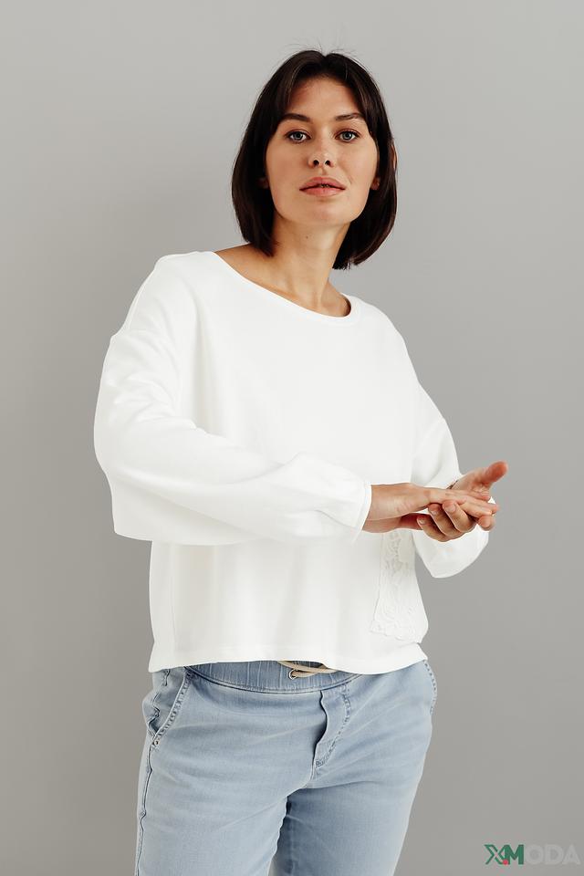 Особенностью модели является кружевная вставка на лицевой стороне, которая придает ей женственности и оригинальности. Пуловер имеет свободный крой и округлый вырез горловины, что обеспечивает комфорт при носке.