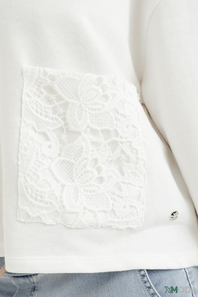Белый пуловер от Monari – это стильная и комфортная модель из 100% хлопка. Декоративный элемент в виде кружевной вставки добавляет изысканности, а свободный крой обеспечивает удобную посадку. Состав: хлопок 100%