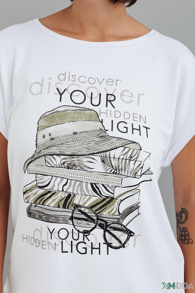 Белая футболка Monari с оригинальным принтом в виде шляпы и очков станет стильным дополнением к вашему образу. Модель выполнена из мягкой вискозы с добавлением модала и эластана, обеспечивающих комфорт и удобство в носке. Состав: вискоза 45%, модал 45%, эластан 10%