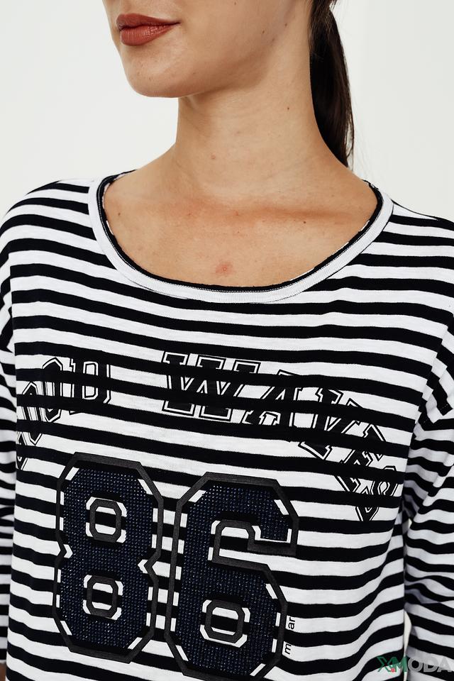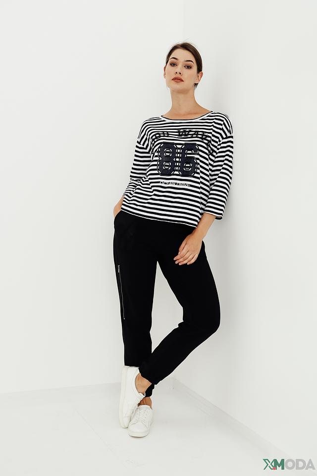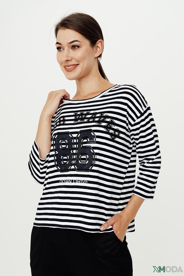Женская футболка Monari чёрно-белого цвета с ярким принтом и коротким рукавом. Стильная модель из 100% хлопка обеспечит комфорт и удобство в повседневной носке. Состав: хлопок 100%