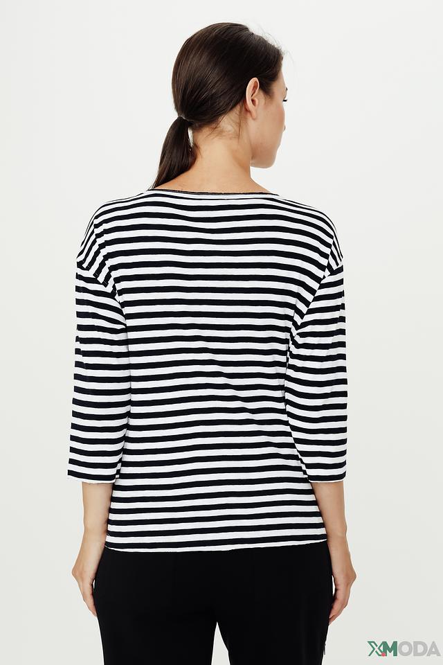 Эта футболка от Monari станет отличным дополнением к вашему гардеробу. Модель выполнена в классическом чёрно-белом цвете с горизонтальными полосами, что визуально освежает образ.