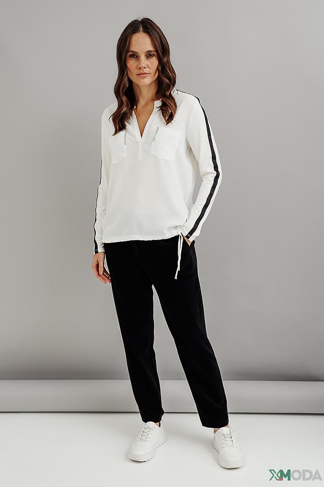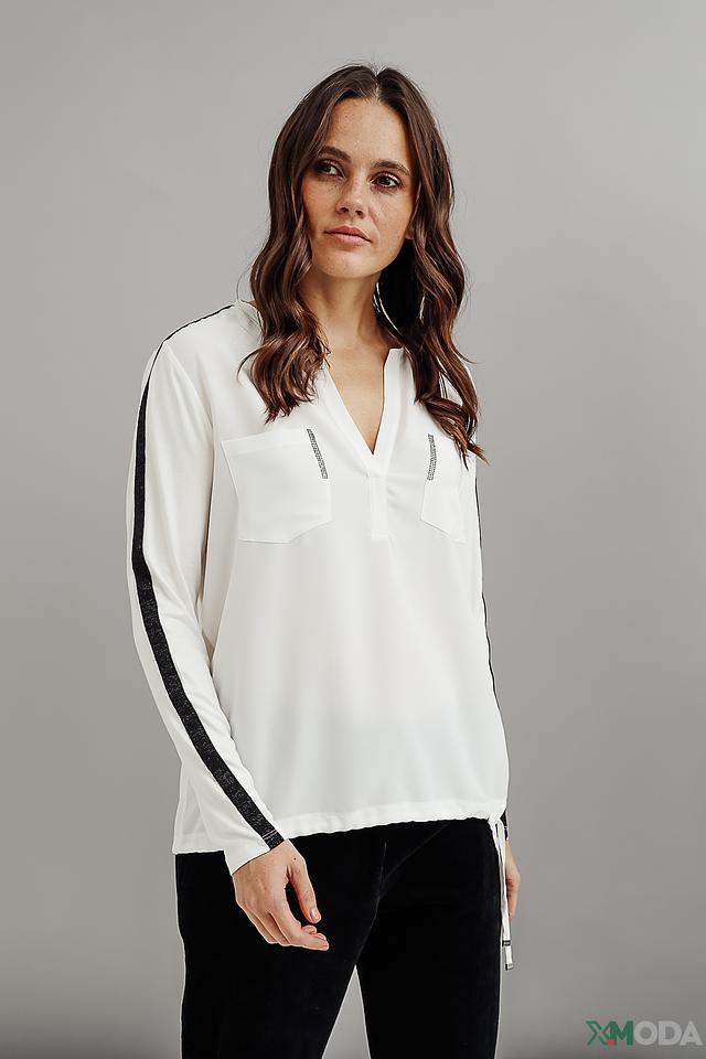 Белая блуза Monari с чёрной полоской на рукавах – стильное и комфортное решение для создания повседневного образа. V-образный вырез и деликатная отделка придают модели изящность. Состав: Состав_2 полиэстер 100%, вискоза 92%, полиэстер 8%