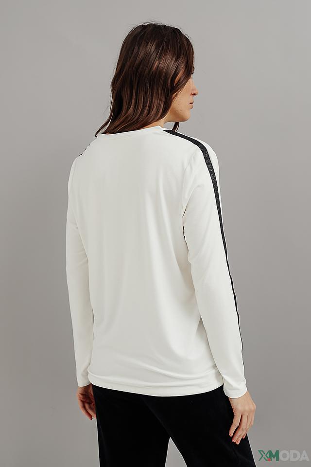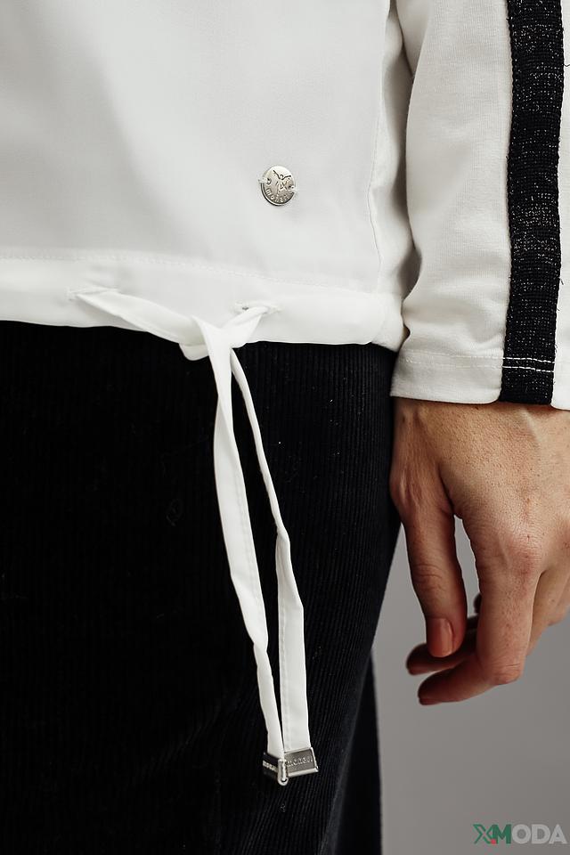 Эта блуза от Monari станет отличным дополнением к вашему гардеробу. Выполнена в белом цвете, она имеет прямой крой и длинные рукава, украшенные контрастной чёрной полоской.
