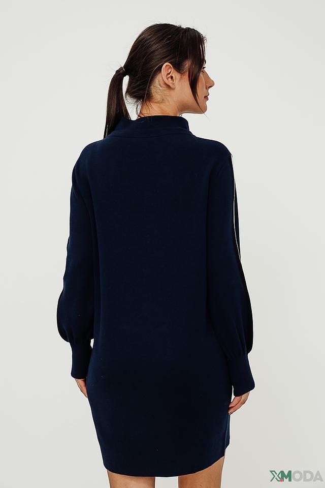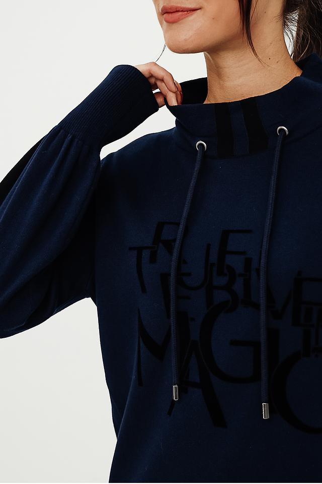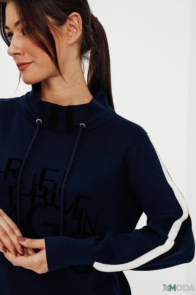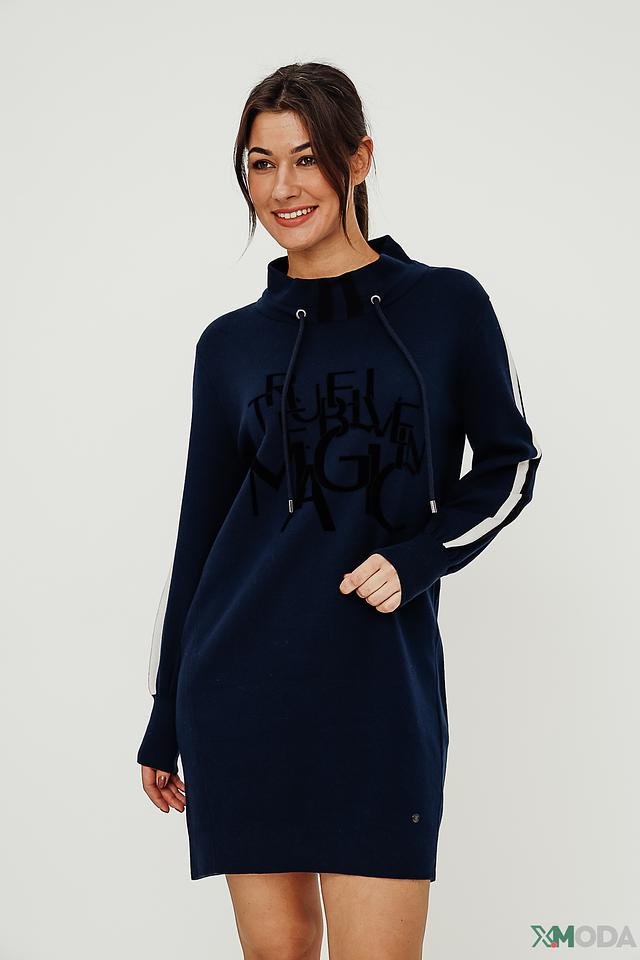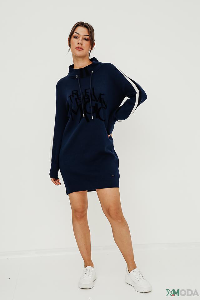 Синее трикотажное платье от Monari с капюшоном и белыми полосами на рукавах. Удобный и стильный вариант для повседневной носки, выполнен из мягкого хлопка с добавлением полиамида. Состав: хлопок 97%, полиамид 3%