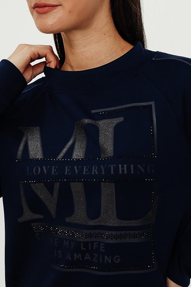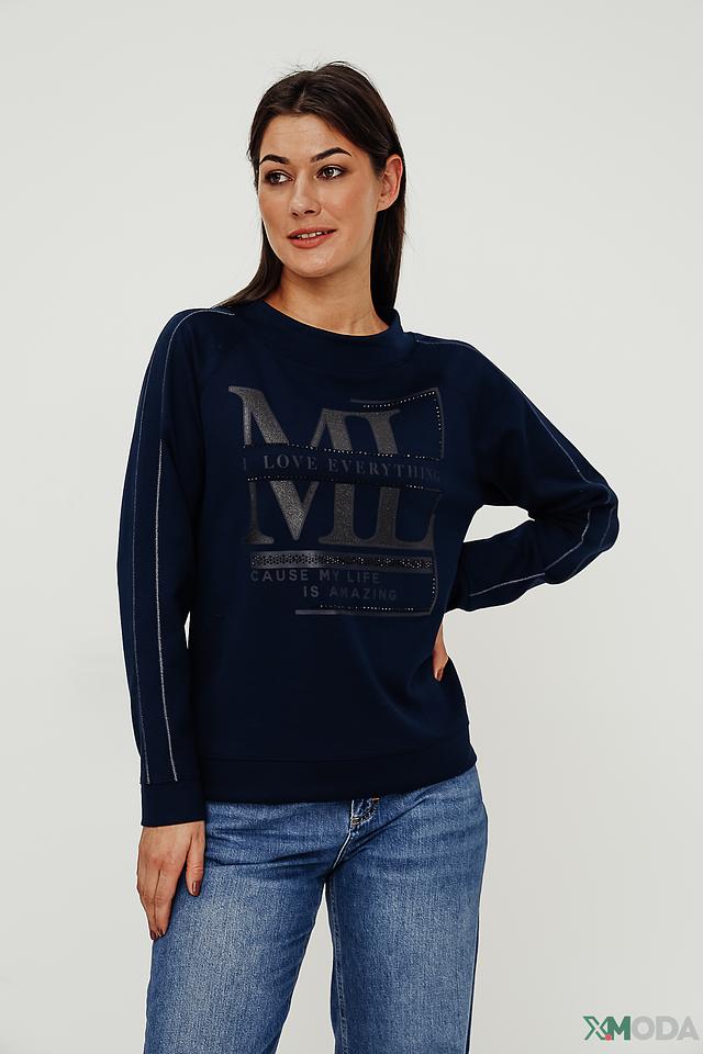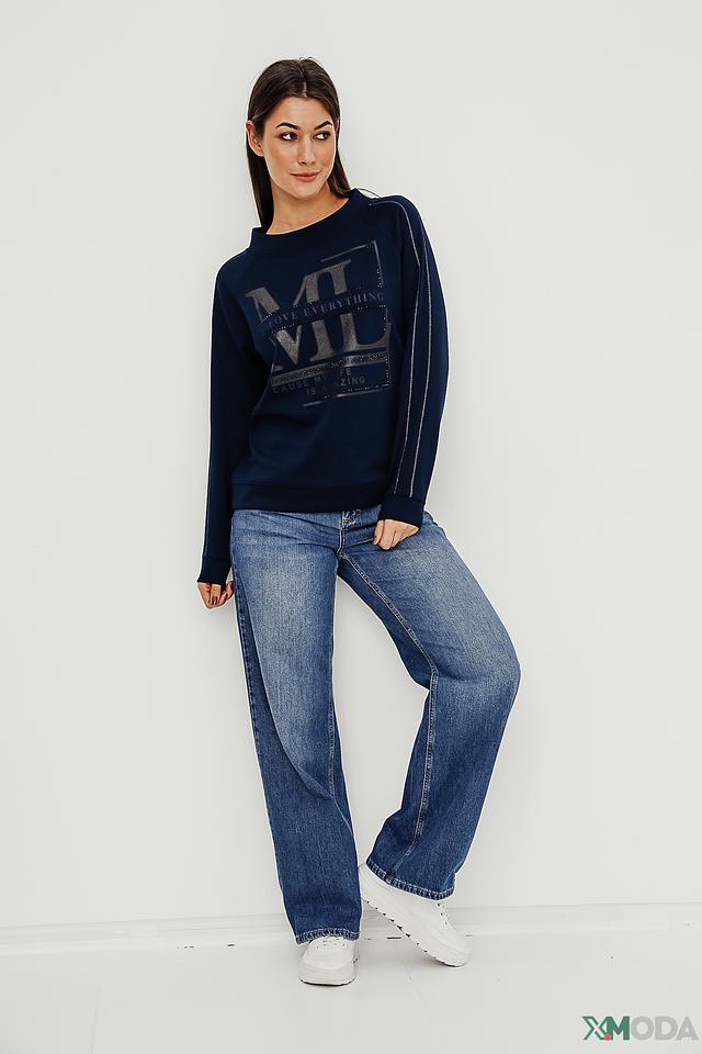 Этот стильный джемпер от Monari станет отличным дополнением к вашему гардеробу. Выполненный в насыщенном синем цвете, он привлекает внимание оригинальным принтом с надписями и декоративными элементами.