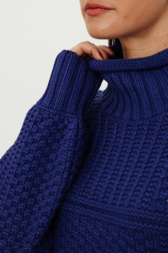 Модель имеет классический крой с высоким воротом и длинными рукавами. Особое внимание привлекает рельефный узор в виде кос, который добавляет изделию оригинальности и текстуры. Водолазка прекрасно сочетается с джинсами, брюками и юбками, позволяя создавать разнообразные образы.