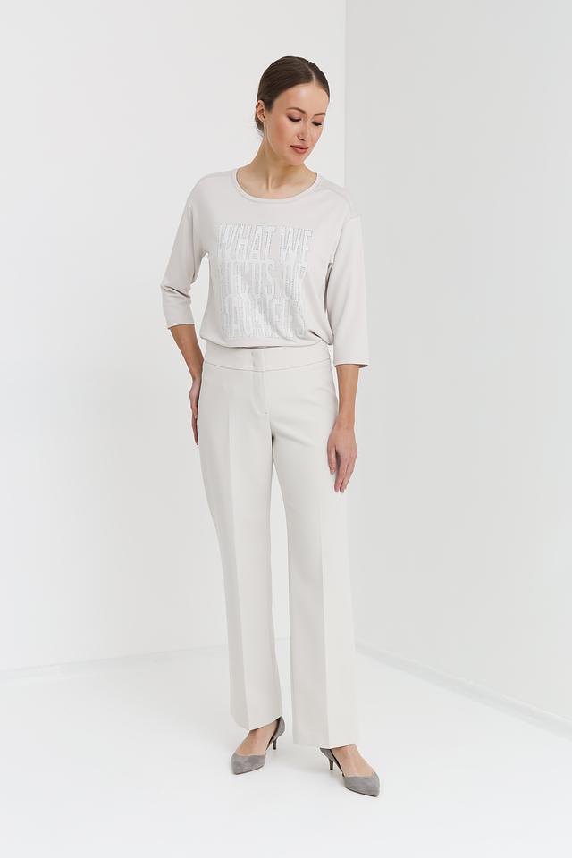 Женский лонгслив Monari светло-серого цвета с эффектным принтом "WHAT WE FOCUS ON MAGNIFIES". Модель выполнена из мягкой и приятной к телу ткани с добавлением вискозы и модала, обеспечивающей комфорт в носке. Состав: вискоза 45%, модал 45%, эластан 10%