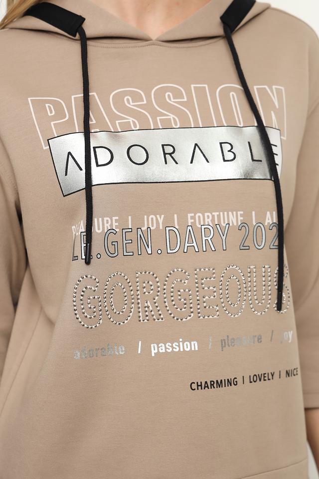 Модель имеет свободный крой, короткие рукава и удобный капюшон с черной окантовкой и шнурком. Передняя часть украшена ярким принтом с надписями и стразами, добавляющим образу индивидуальность.