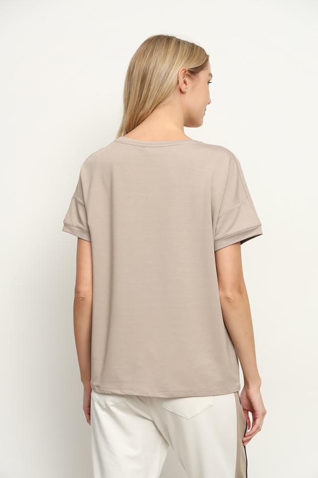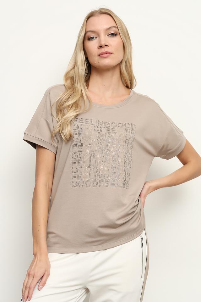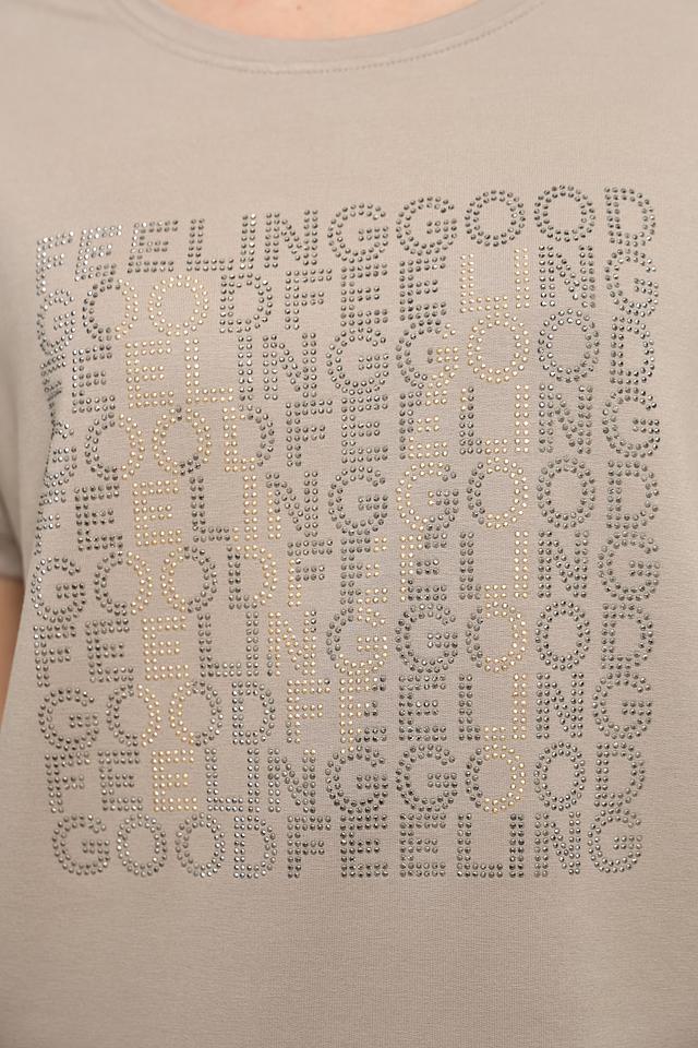 Женская футболка Monari бежевого цвета с эффектным декором из страз. Модель свободного кроя с короткими рукавами станет отличным дополнением к вашему образу. Состав: вискоза 45%, модал 45%, эластан 10%