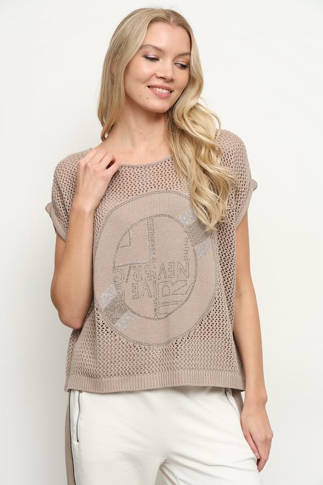 Бежевый жилет Monari из 100% хлопка с оригинальным круглым принтом. Модель без рукавов с округлым вырезом горловины, выполненная в лёгком ажурном плетении. Состав: хлопок 100%