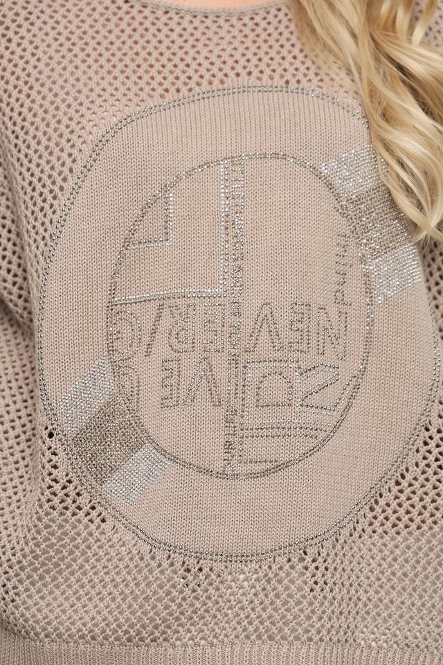 Жилет имеет бежевый цвет и украшен крупным круглым принтом с абстрактным рисунком. Ажурное плетение придает изделию легкость и оригинальность.