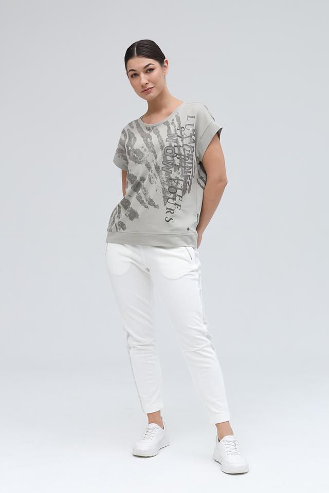 Стильная блуза Monari серого цвета с оригинальным принтом в виде зебры и декором из страз. Модель свободного кроя с короткими рукавами станет отличным дополнением к вашему образу. Состав: хлопок 82%, модал 13%, эластан 5%