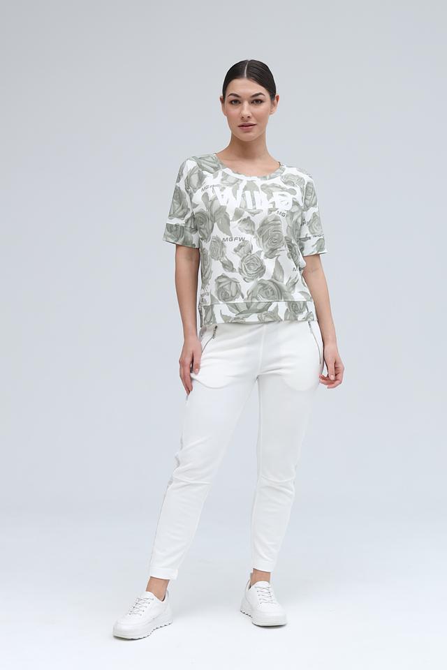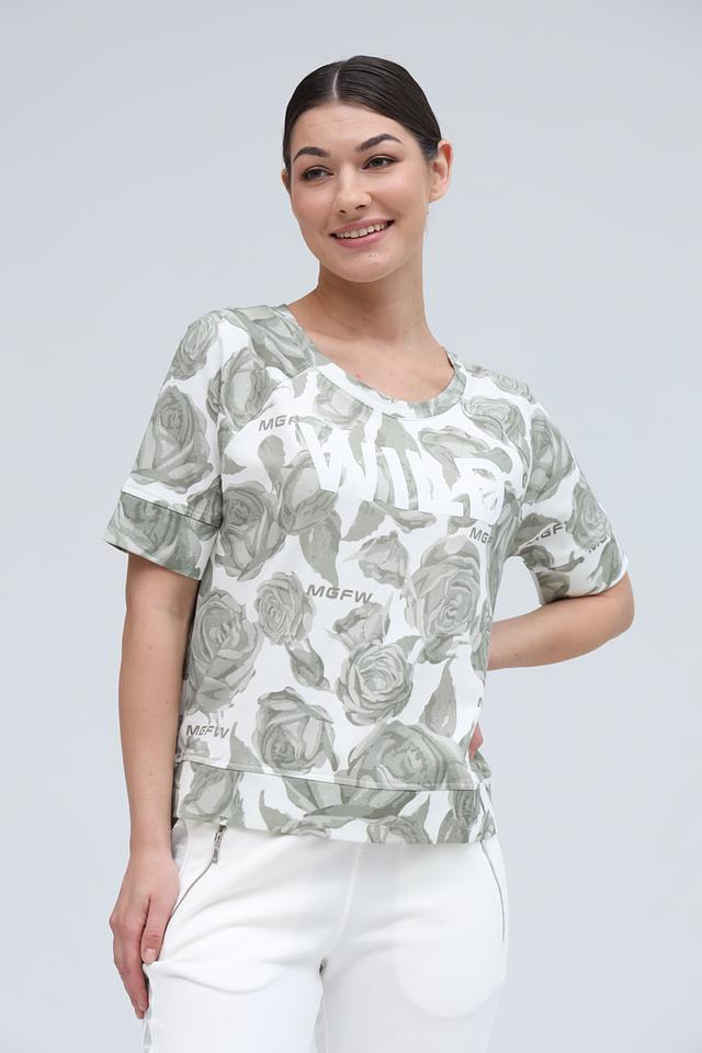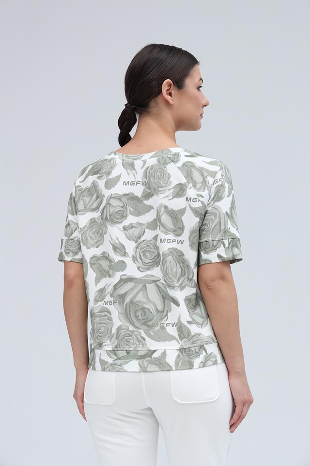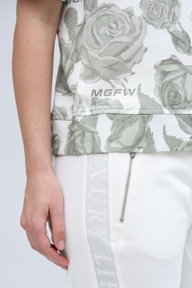 Особенностью данной модели является оригинальный цветочный принт в светло-зелёных и белых тонах. Принт выполнен в виде крупных роз, что придаёт блузе романтичный и женственный вид. На блузе также присутствуют надписи бренда.