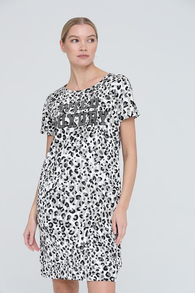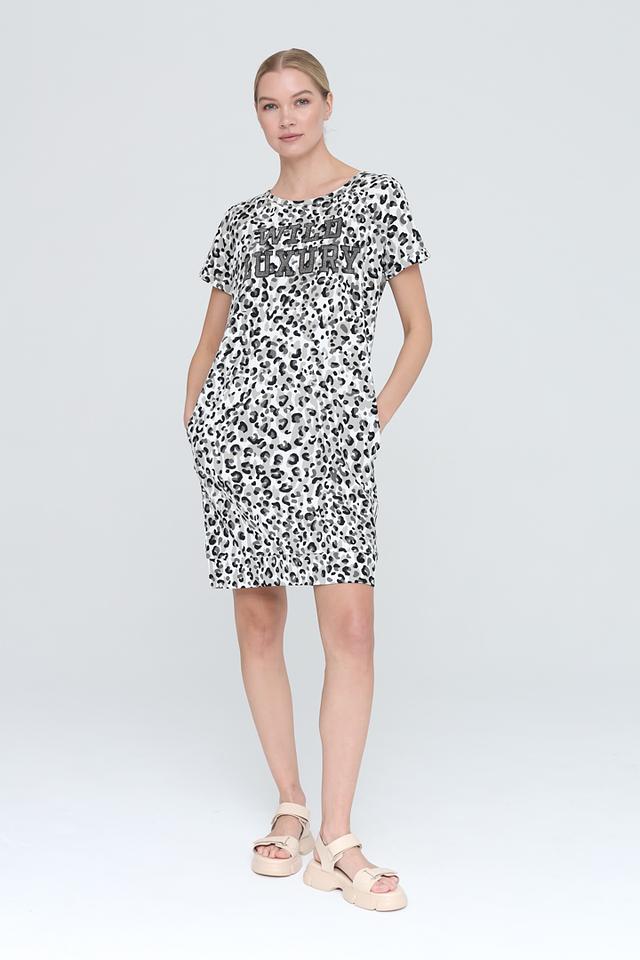 Короткое платье Monari белого цвета с леопардовым принтом и надписью "WILD LUXURY". Изготовлено из хлопка с добавлением полиэстера, обеспечивающего комфорт и практичность. Идеальный выбор для создания стильного и непринужденного образа. Состав: хлопок 70%, полиэстер 30%