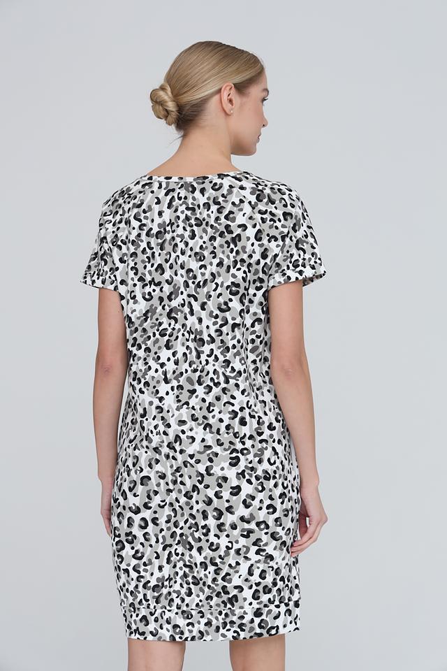 Это короткое платье от Monari выполнено в белой цветовой гамме и украшено эффектным леопардовым принтом. Модель имеет прямой силуэт и короткие рукава, что делает ее удобной и подходящей для повседневной носки.