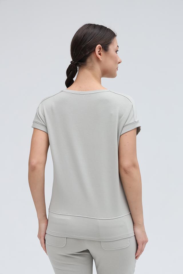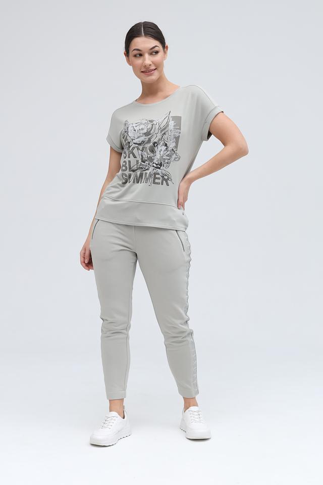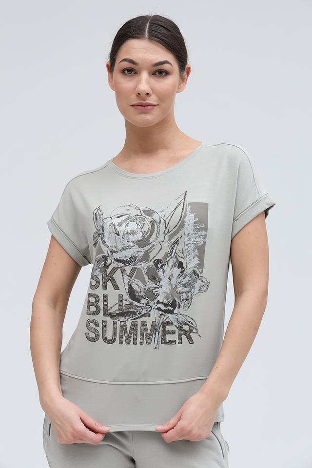 Женская футболка Monari серого цвета с оригинальным принтом. Модель выполнена из мягкого и приятного к телу трикотажа, обеспечивающего комфорт в носке. Футболка станет отличным дополнением к вашему повседневному гардеробу. Состав: вискоза 45%, модал 45%, эластан 10%