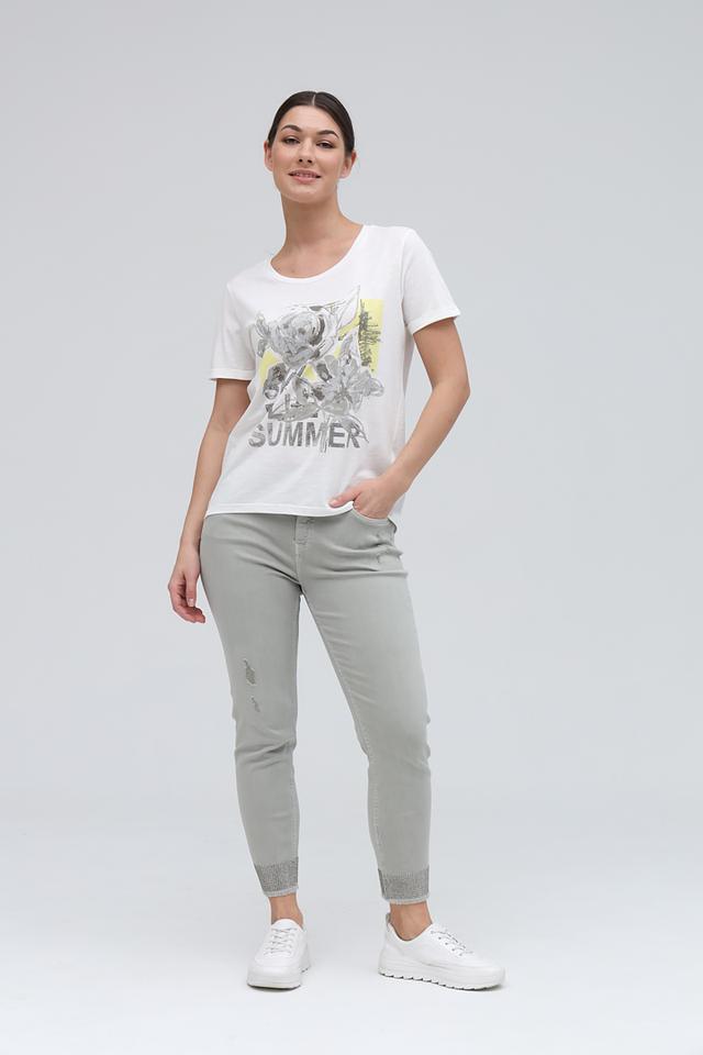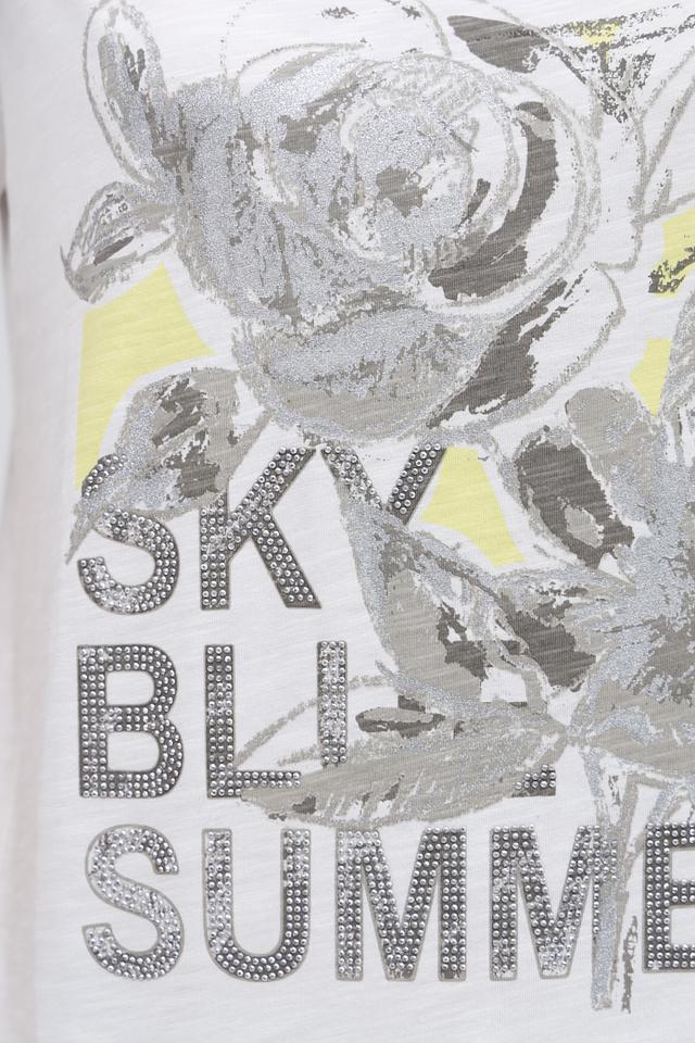 Эта стильная футболка от Monari выполнена в белом цвете и украшена эффектным цветочным принтом с добавлением надписи "Sky Blu Summer". Принт выполнен в серо-желтых тонах, что придает футболке легкость и свежесть.